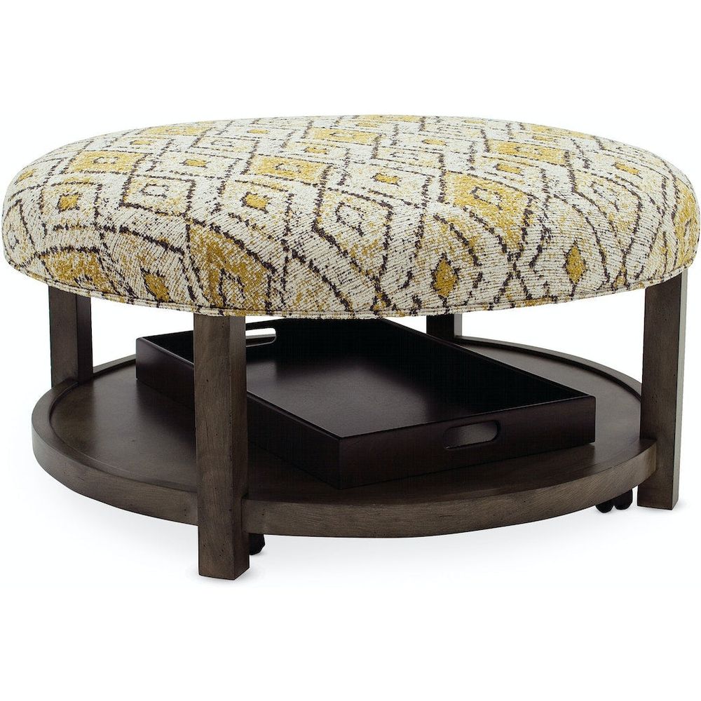 Introducing what we truly do best - great design, intricate, multi-step hand finishes and on-trend fabric offerings - to the occasional furniture category, the highly customizable Cocktails & More program offers a variety of options on eight upholstered cocktail tables, each of which include cocktail trays and casters. Available in round, square, oval or rectangle, the upholstered cocktail ottomans are available in a choice of more than 650 fabric options with tufted or non-tufted tops and a choice of eight finishes. An additional 15 Premier finishes - hand applied by our artisans - are also available, along with contrasting welt options and a choice of two sizes of nail-head detailing, available in four different finishes for further customization. Melding form with function, each style includes complementary solid wood serving trays for use in entertaining and hidden, locking casters for easy movement. The solid wood trays are crafted to nest on the cocktail ottomans' bottom shelf for storage when not in use. Strategically placed wooden positioning pins on the bottom shelf help to lock the trays in place.