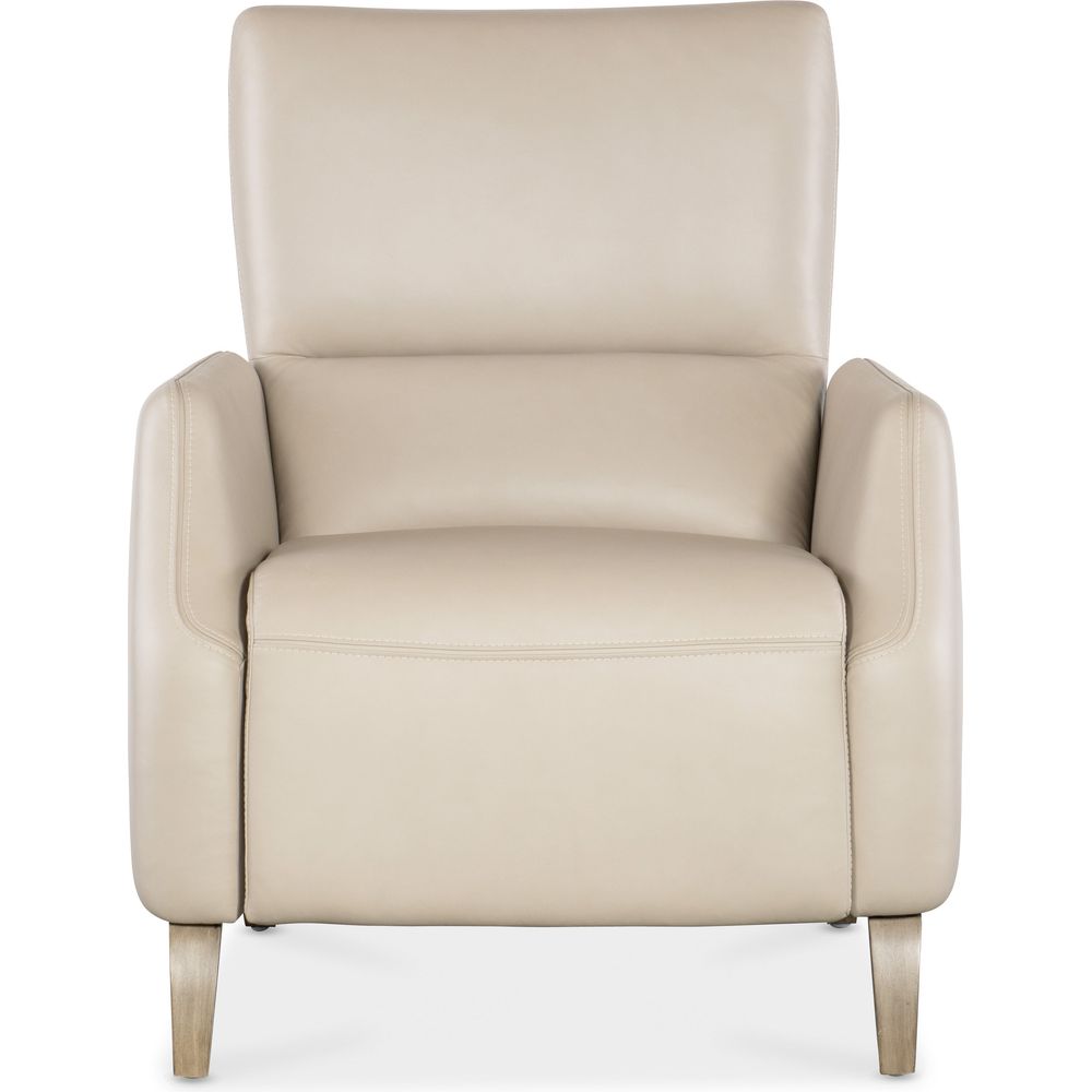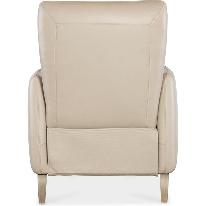 Description: A harmonious blend of curvaceous lines, the Rumero press-back upholstered leather recliner has shaped arms and a modern bustle-style back. Curved wood legs in a light finish add to the sense of energy in the silhouette. The semi-aniline top-grain leather cover is called Apollo Mineral.