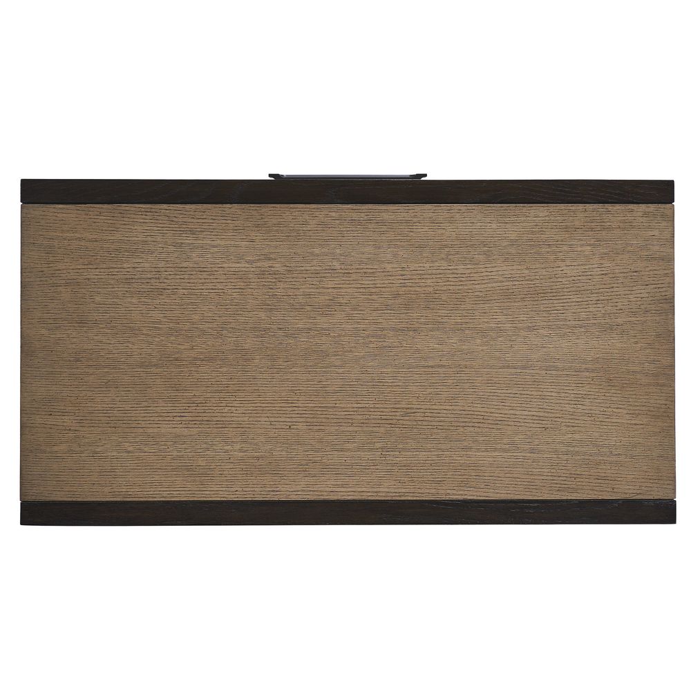 Marketing Copy: Zanzibar offers a fresh take on relaxed contemporary living. In a play on contrasts, designs are crafted from quartered white oak ina warm taupe finish with bases and accents in a deep expresso coloration. Surfaces are gently wire-brushed to enhance the woods natural grain, while sleek custom hardware, finished in dark umber, offers a striking complement. Upholstered seating features clean architectural lines with exceptional tailoring, highlighted by organic and textural fabrics in rich earthy tones. The look is approachable, yet dramatic in tis interpretation of casual contemporary style.