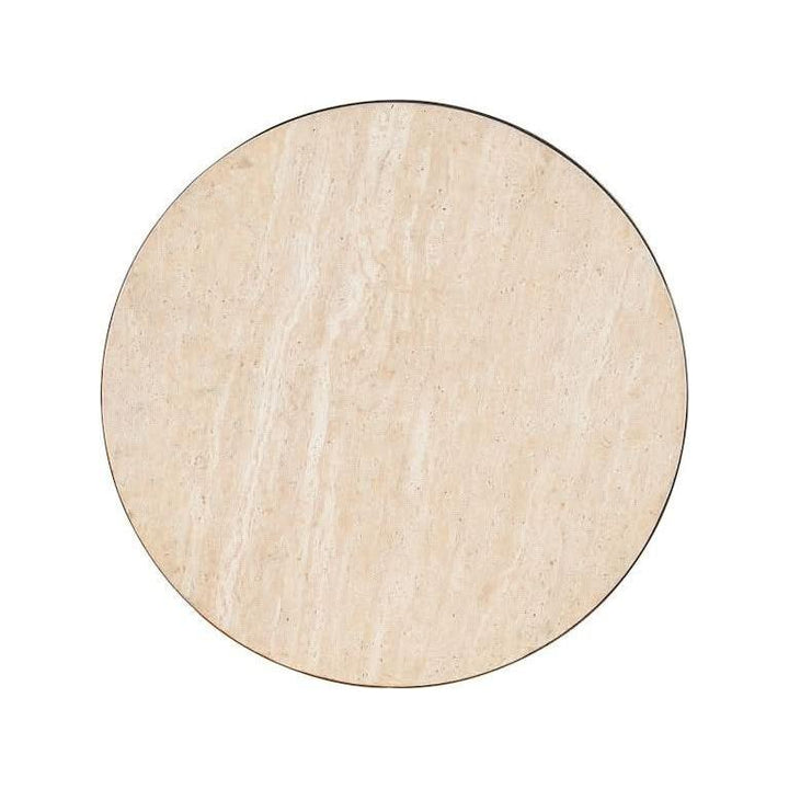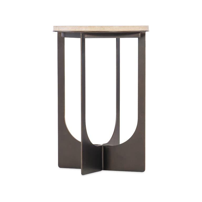 Product Description: Showcasing authenticity of materials and an earthy elegance, the 16-inch-round Sable Drink Table combines a dark bronze-colored U-shaped metal base with a cream-colored honed Travertine top with gray, white and brown tones.