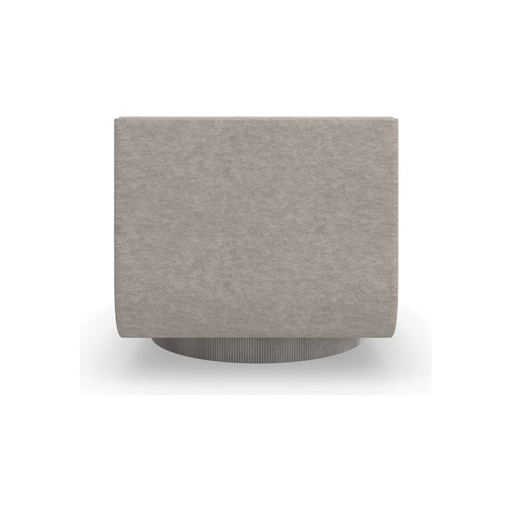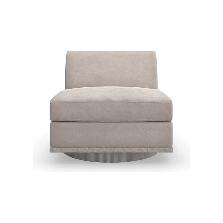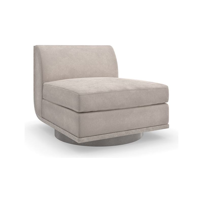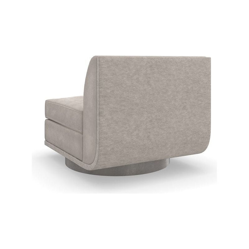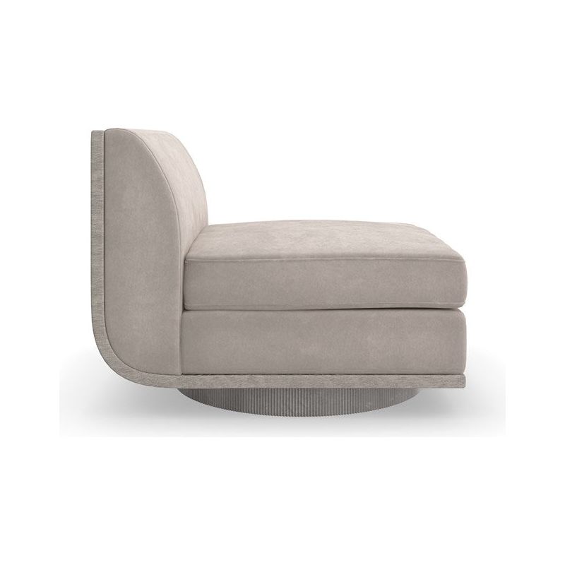 A Space Age-inspired design, this Clipper sectional component calls to mind the undulating, curvaceous aesthetic of an era that fused art and imagination with progress and innovation. Meticulously tailored, its streamlined silhouette is accentuated by a taupe faux-mohair velvet on the inside, and a tactile silver metallic fabric along the outside and back. Like a gear or cog, its rounded plinth base with a micro-reeding detail seamlessly mixes classicism with industrialism for a finishing touch that is uniquely.
