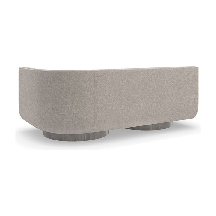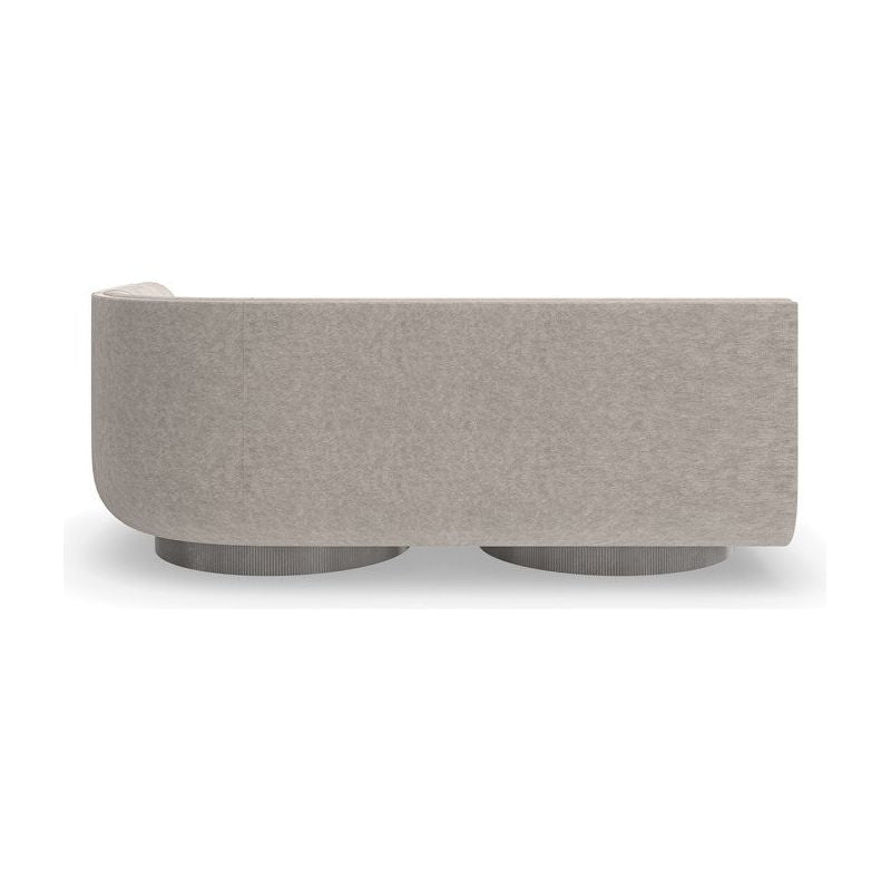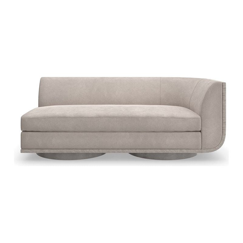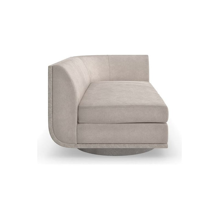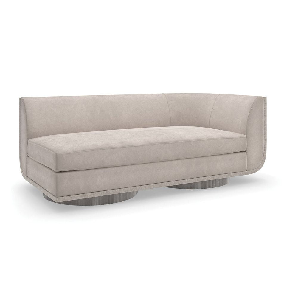 A Space Age-inspired design, this Clipper sectional component calls to mind the undulating, curvaceous aesthetic of an era that fused art and imagination with progress and innovation. Meticulously tailored, its streamlined silhouette is accentuated by a taupe faux-mohair velvet on the inside, and a tactile silver metallic fabric along the outside and back. Like a gear or cog, its rounded plinth base with a micro-reeding detail seamlessly mixes classicism with industrialism for a finishing touch that is uniquely.