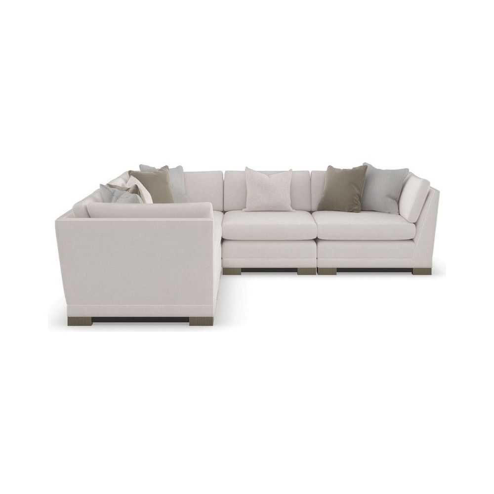 With a classic shelter style, this three-piece modular sectional brings the perfect mix of lounge-like comfort and everyday luxury. Crisp tailoring and braided leather welt artfully accentuate the clean modern lines of each piece, dressed in a softly textured chenille performance fabric that's easy to keep clean. Fluted legs in Silver Shadow paint add a hint of shimmer and dramatic contrast to its Dark Chocolate wood base. Create a custom seating area by choosing the number of pieces to suit your space and taste.