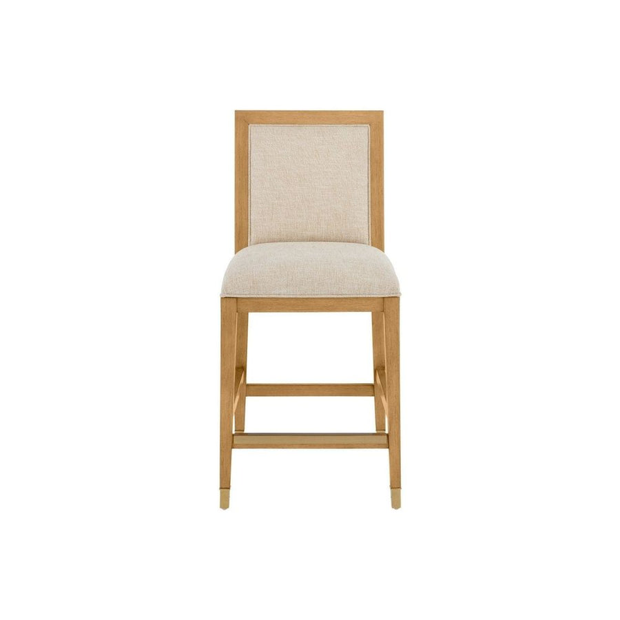 Description: The Santos Sea Sand Counter Stool has a split rattan pattern on the back, which is made by hand and applied to a solid mahogany frame. Once the natural material is in place, a sea sand finish covers the back, frame, and legs. The tan counter stool is upholstered in a Liller Malt material. The stool has brass ferrules with a capped step to add sophistication to the overall design.