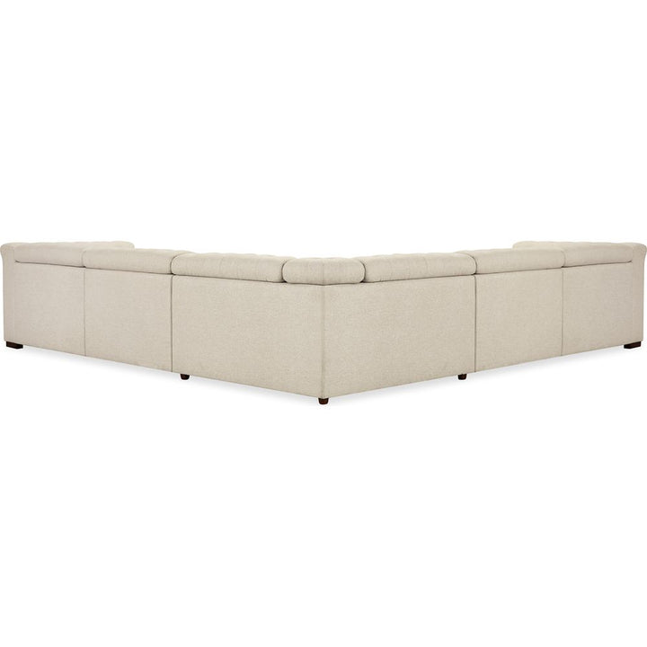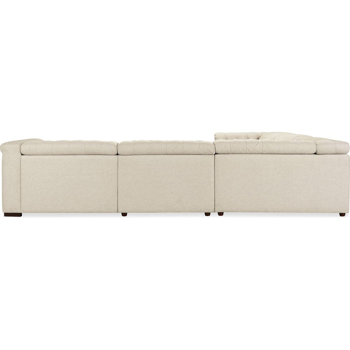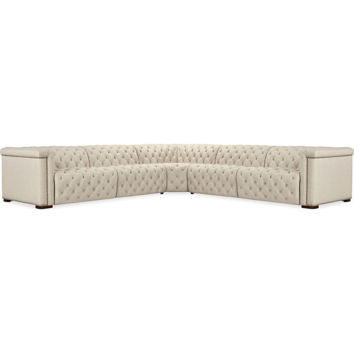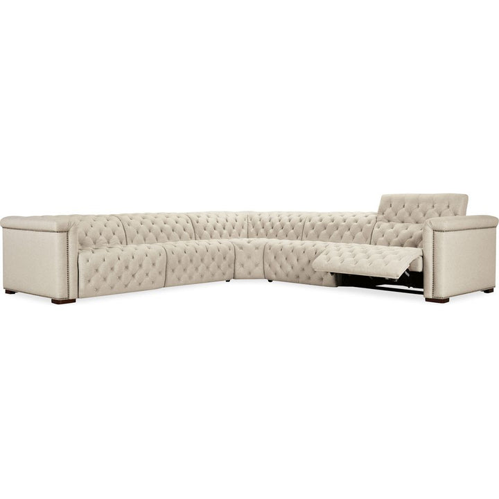 Description: Upholstered in Aries Beach performance fabric, the Savion Deux 5 Seat Sectional offers four power recliners and six power headrests, creating the ultimate seating experience. The fabric's smooth texture is paired with dark wood accents, chesterfield tufting, and copper-toned nail trim for a blend of comfort and timeless appeal. The discreet power reclining function adds modern convenience without compromising style.