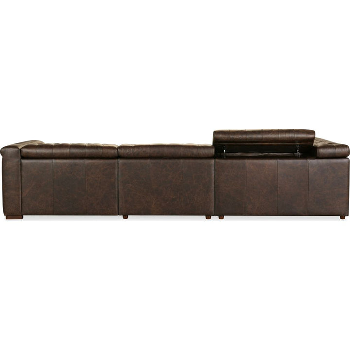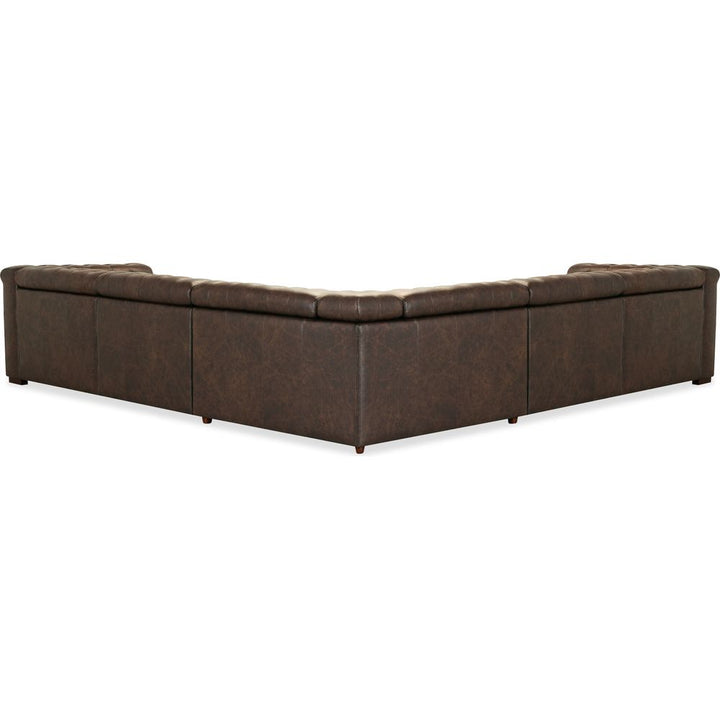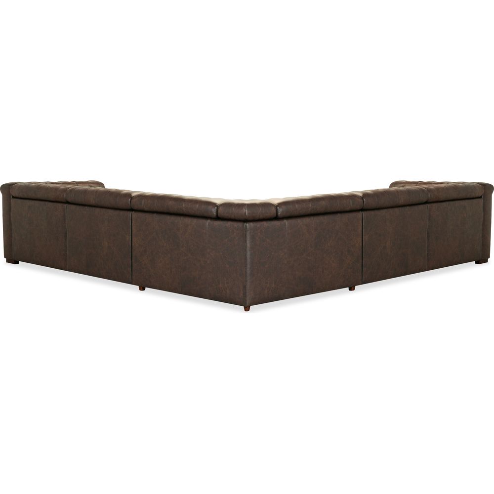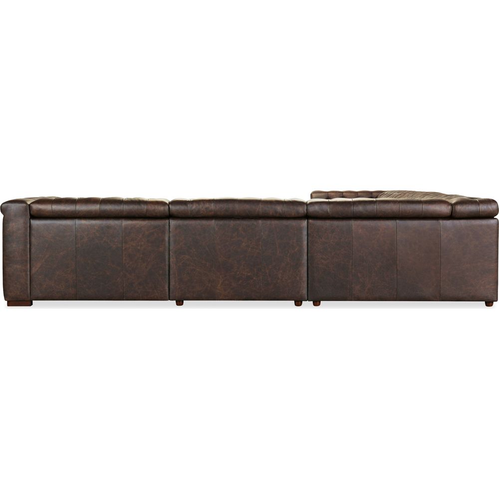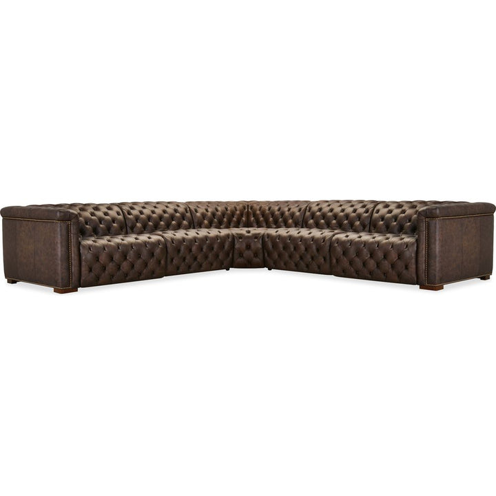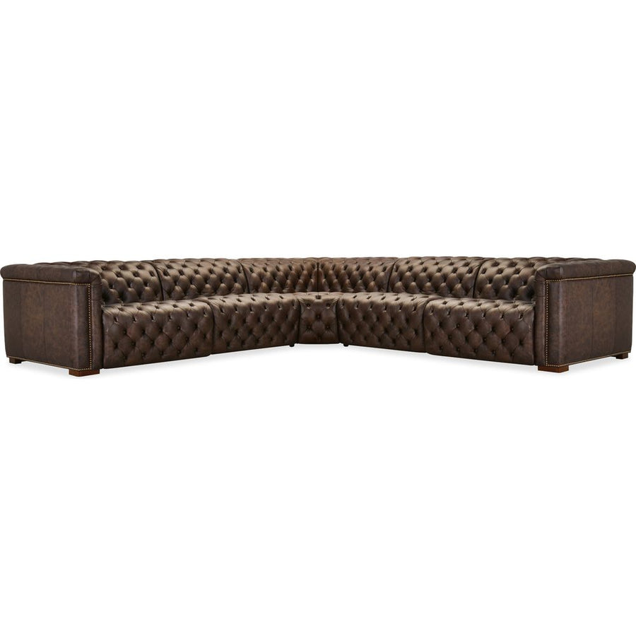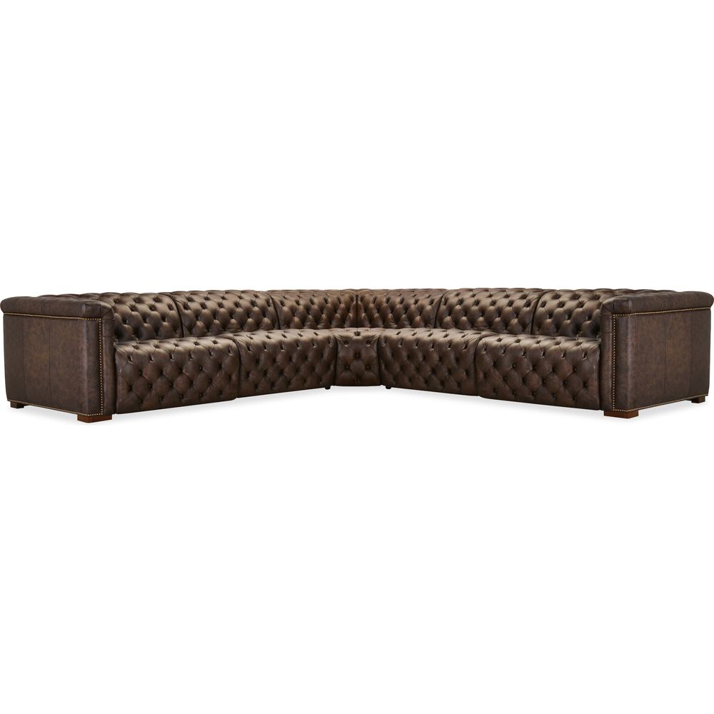 Description: The Savion Deux 5 Seat Sectional with three power recliners and six power headrests is upholstered in luxurious West Saddlewood Top Grain leather. This sectional features classic chesterfield tufting, copper-toned nail trim, and dark wood accents for a seamless blend of sophistication and comfort. With power reclining seats at each end and one armless seat, it's the perfect centerpiece for a large living room.