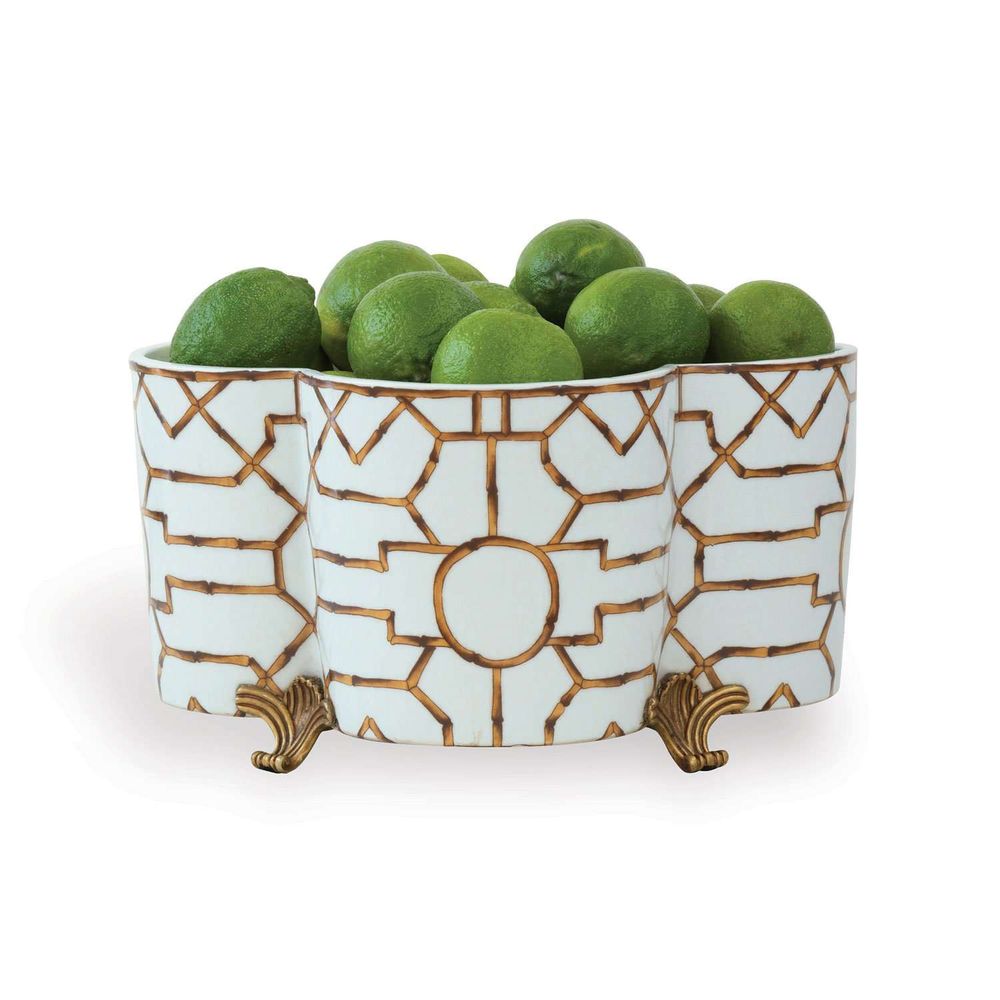 Classic shaped quatrefoil planter. Featuring our Scalamandre Maison "Baldwin" pattern, the antiqued porcelain centerpiece planter is shaped to hold four-6" diameter plants. Perfect for a spray of orchids. Accented with solid brass feet. We also suggest using the planter for fresh flowers as it holds water; or for entertaining as a wine bucket. Simply line the bottom with a towel or bubble wrap for protection, then add ice. Perfect on the buffet sideboard.