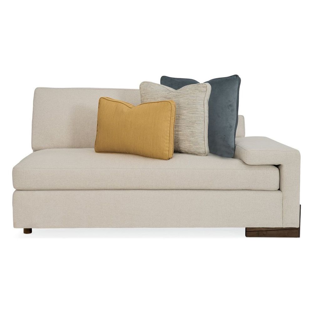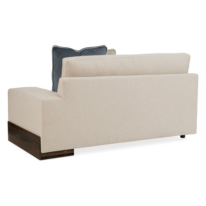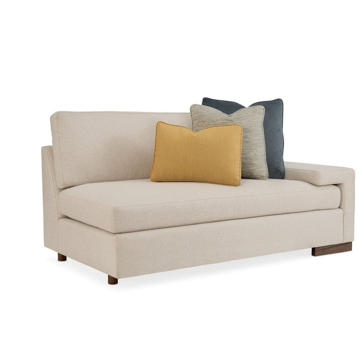 Create a destination in your home with the refined character and comfort of this stunning sectional sofa. Unique by design, its seat cushions nest under a wide shelf-arm creating statement-making style. Destined to be a favorite spot for resting and relaxing, this sectional is upholstered in a neutral, linen-like fabric with a small, modern herringbone pattern. Accent pillows in shades of slate and goldenrod add impact and style. An angular Fumed Gum wood base finished in Smoked Sable cradles the frame and imparts a finishing touch that grounds its design presence.
