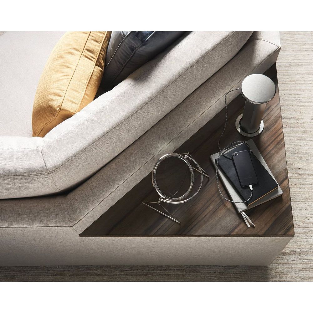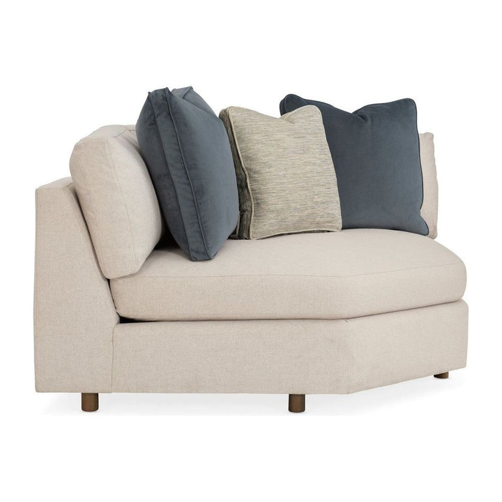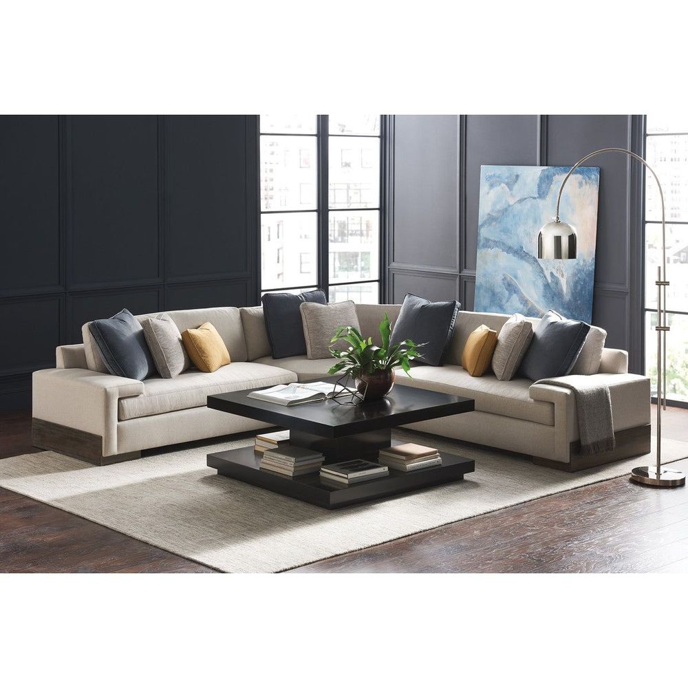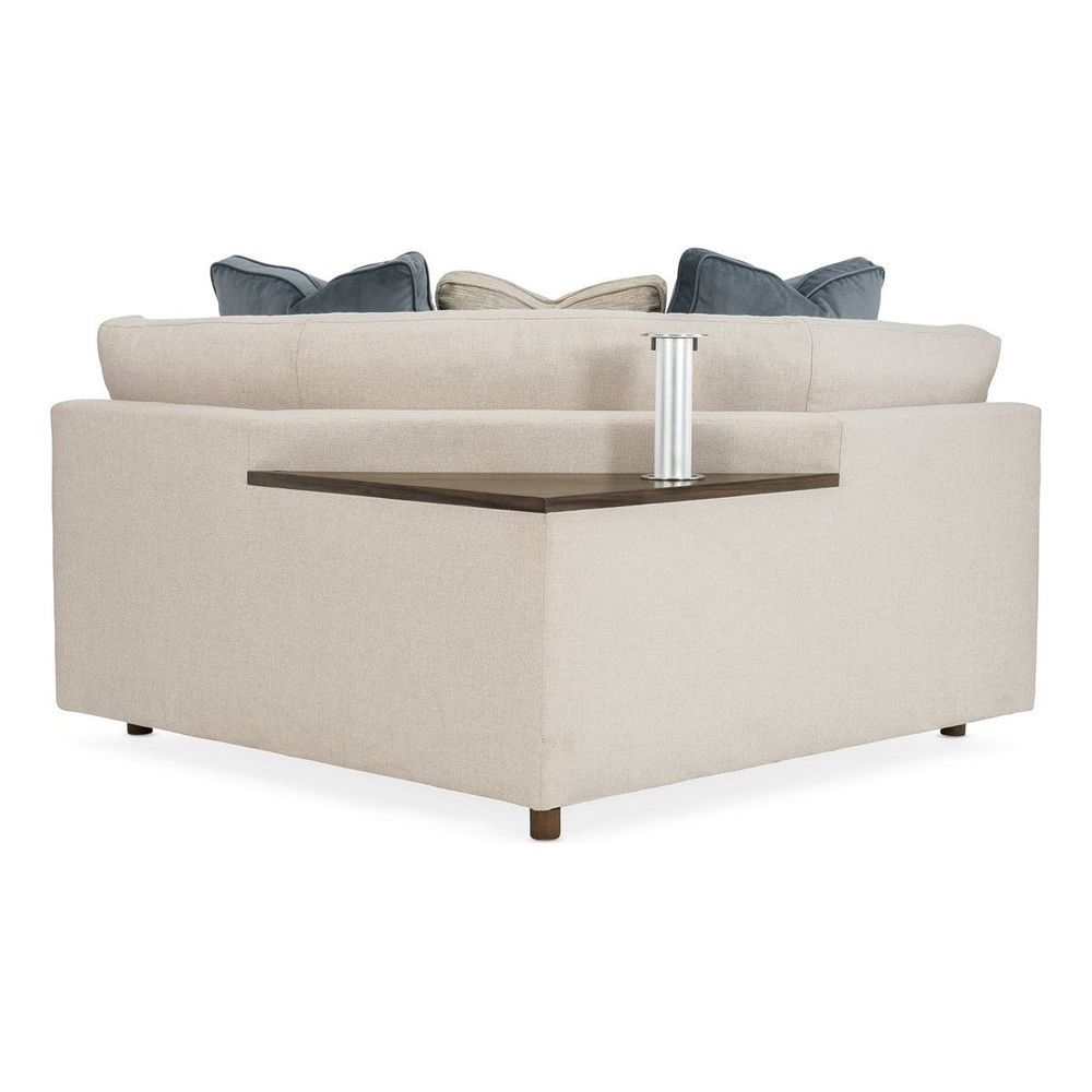 A thoughtfully designed center wedge that features a wood shelf finished in Smoked Sable and provides a place for snacks and beverages while concealing a pop-up with multinational AC and USB charging plugs. Destined to be a favorite spot for resting and relaxing, this piece is upholstered in a neutral, linen-like fabric with a small, modern herringbone pattern. Accent pillows in shades of slate and goldenrod add impact and style.