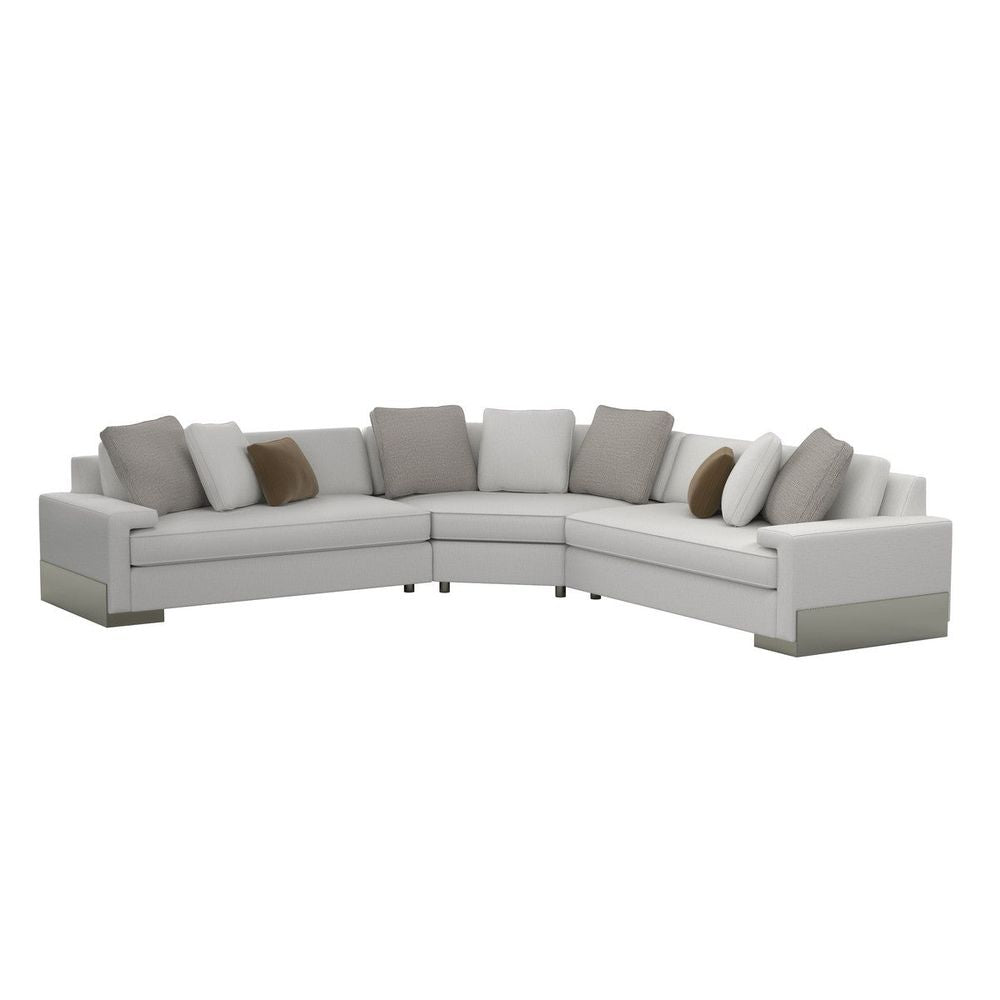 Create a destination in your home with the refined character and comfort of this stunning sectional sofa. Unique by design, its seat cushions nest under a wide shelf-arm creating statement-making style. Destined to be a favorite spot for resting and relaxing, this sectional is upholstered in a neutral, linen-like fabric with a small, modern herringbone pattern. An angular wood base finished in Pyrite cradles the frame and imparts a finishing touch that grounds its design presence.