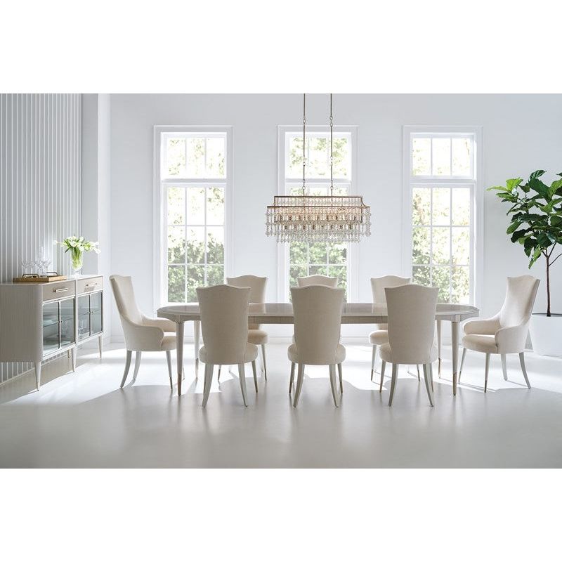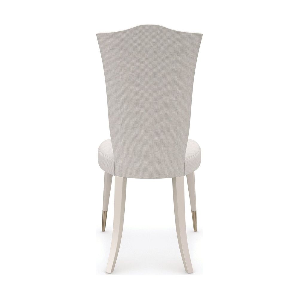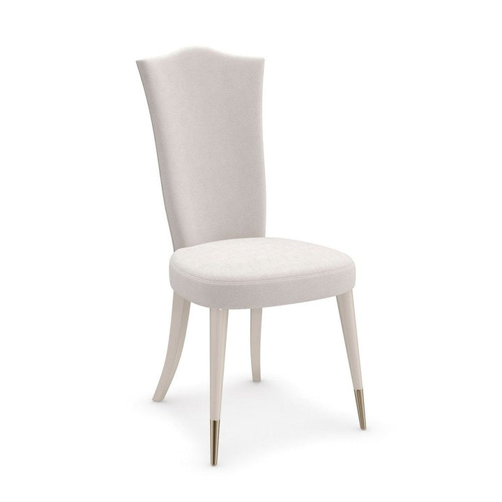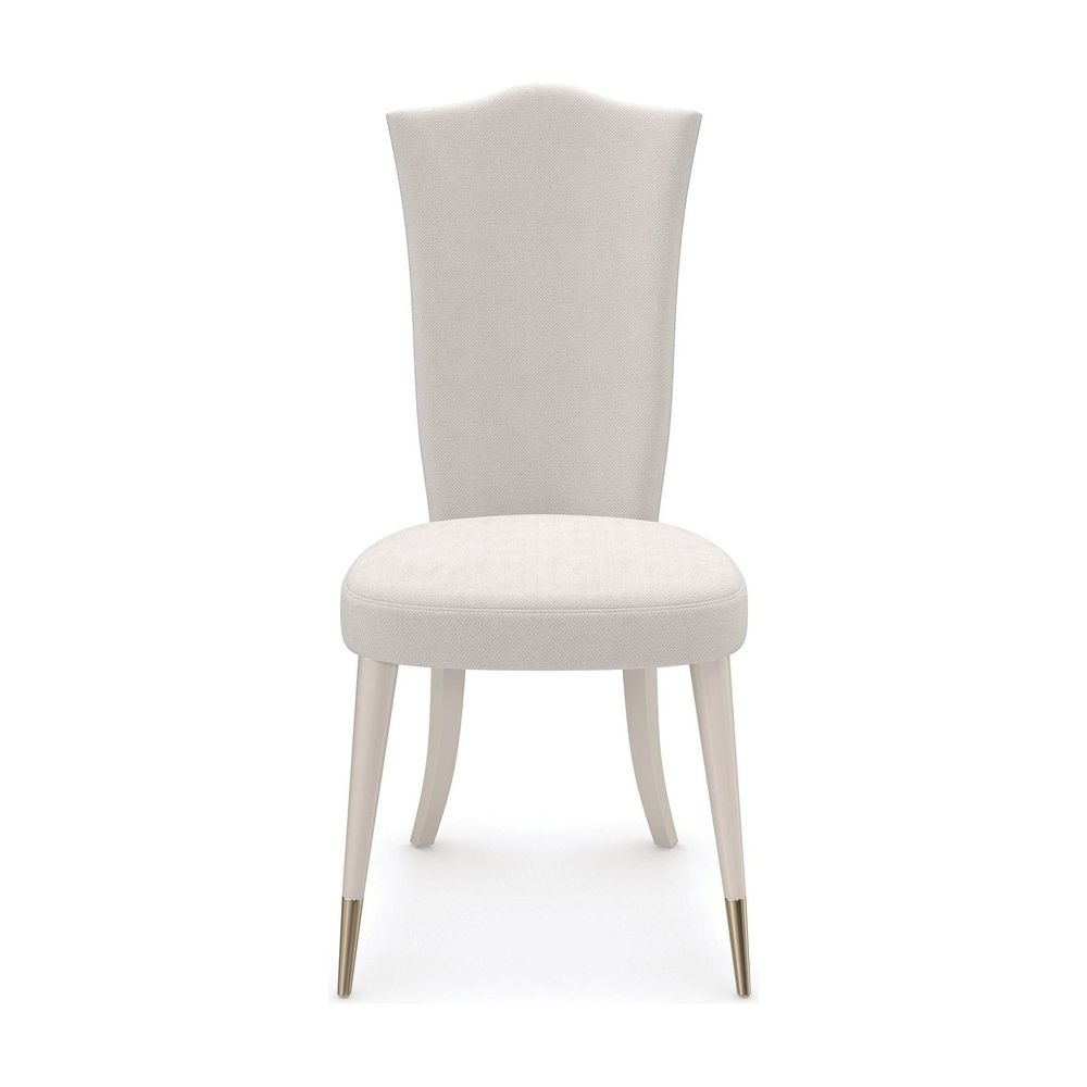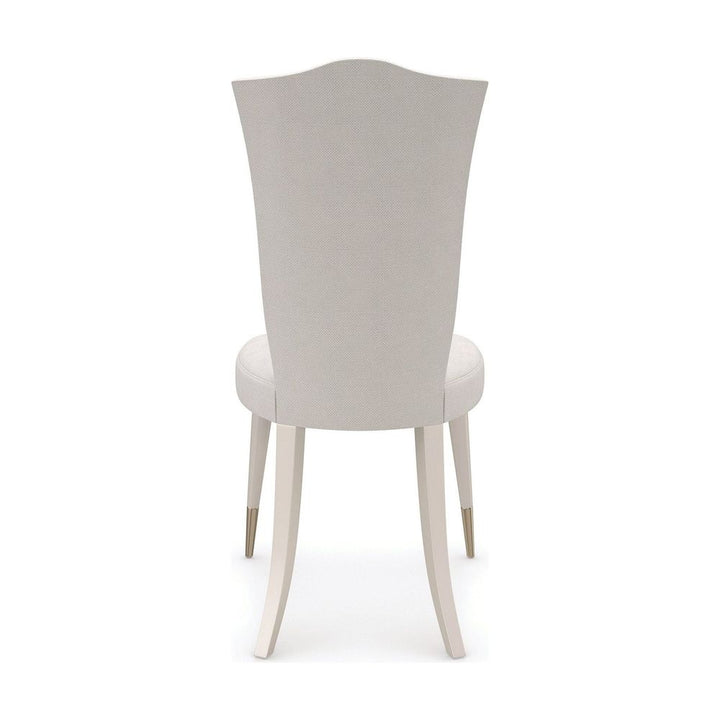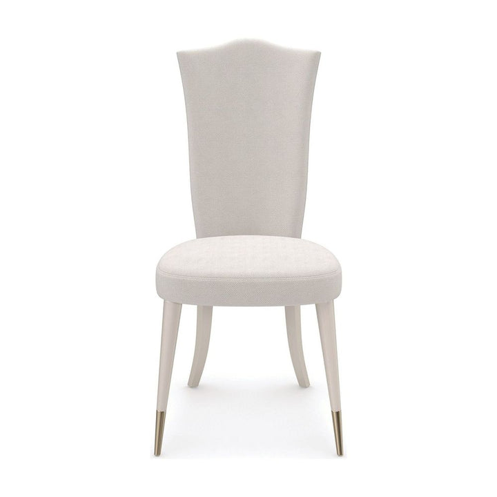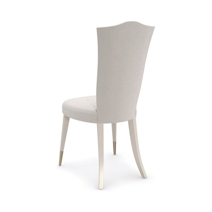 A classic camel back defines this sweetheart of a dining chair, designed with welcoming curves and lumbar support to comfortably seat guests. Fully upholstered with Matte Pearl legs, tapered on the front and capped in a Whisper of Gold metal ferrules. Cherub arm chair also available.