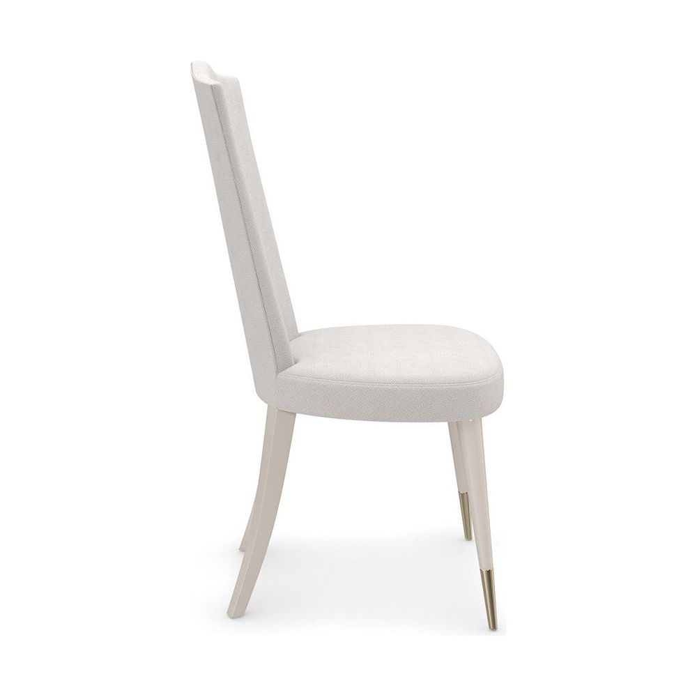Features: Upholstered chair.Legs in Matte Pearl.Front metal ferrules in Whisper of Gold.