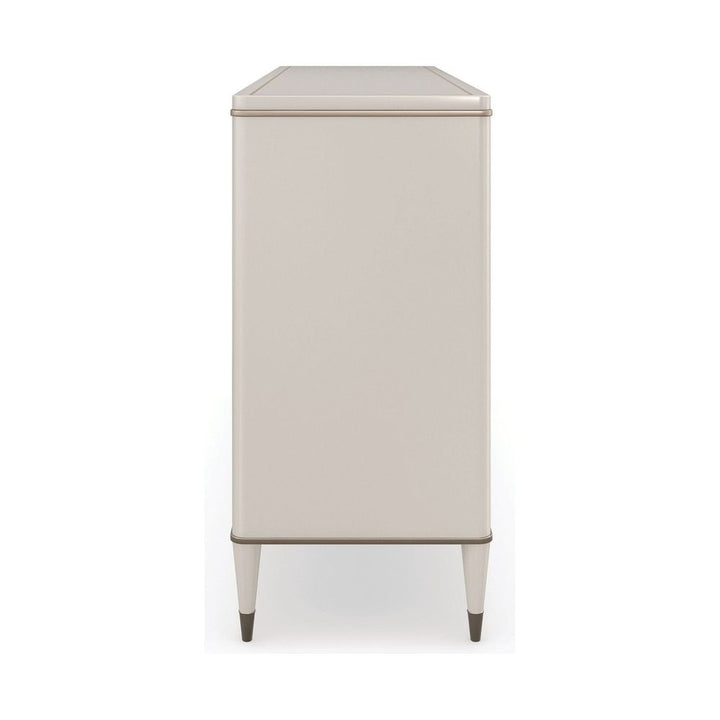 Mirror-like drawer fronts introduce a warmly reflective aesthetic, created from v-groove cut, back-painted glass in a striking radial pattern. A silkscreened pinstripe detail frames the top and adds a touch of luxe, complemented by tapered legs dressed in Bronze Gold ferrules. Eight soft-close drawers offer tucked away storage, with Linen-painted interiors to coordinate with its Matte Pearl frame.