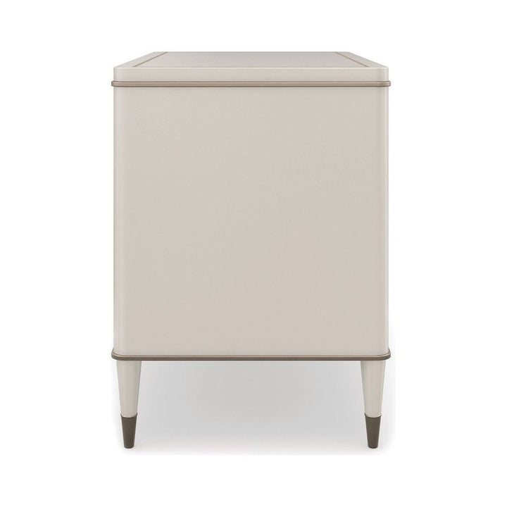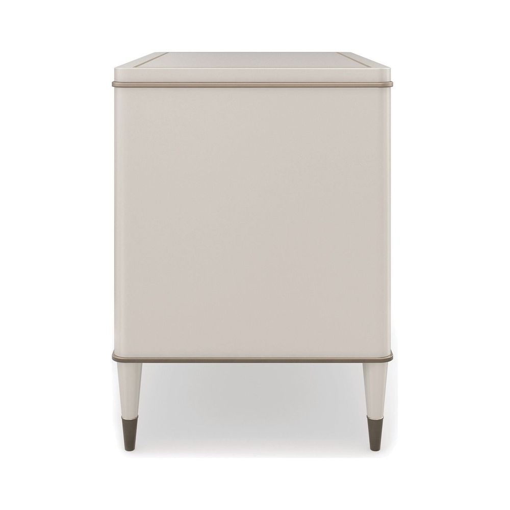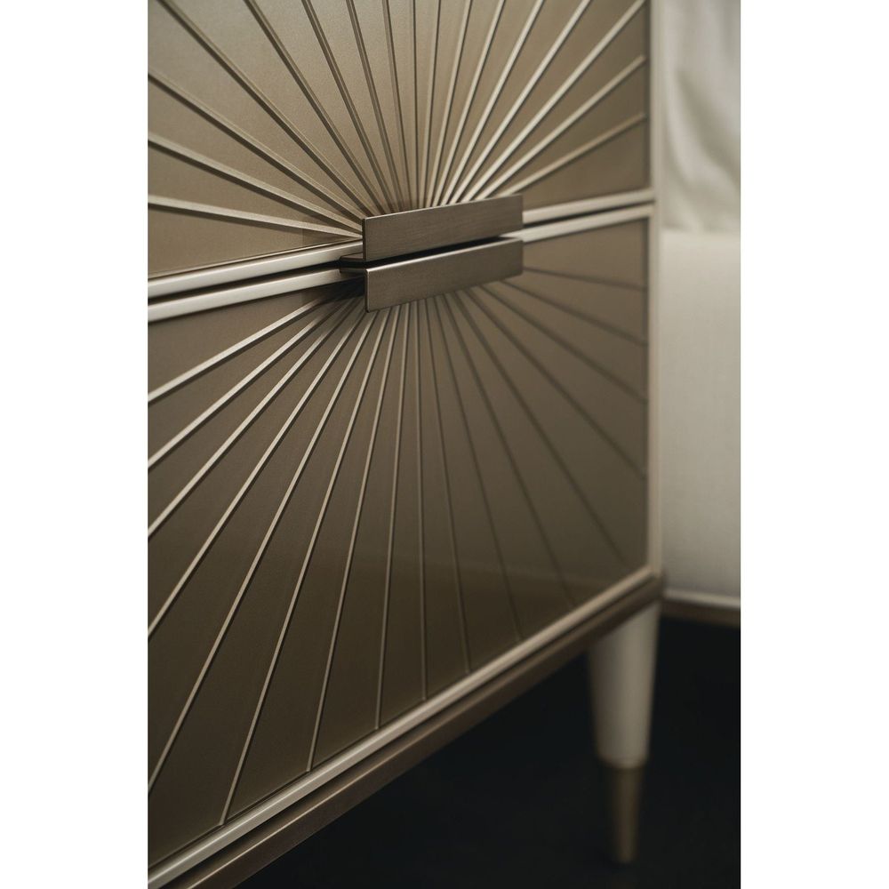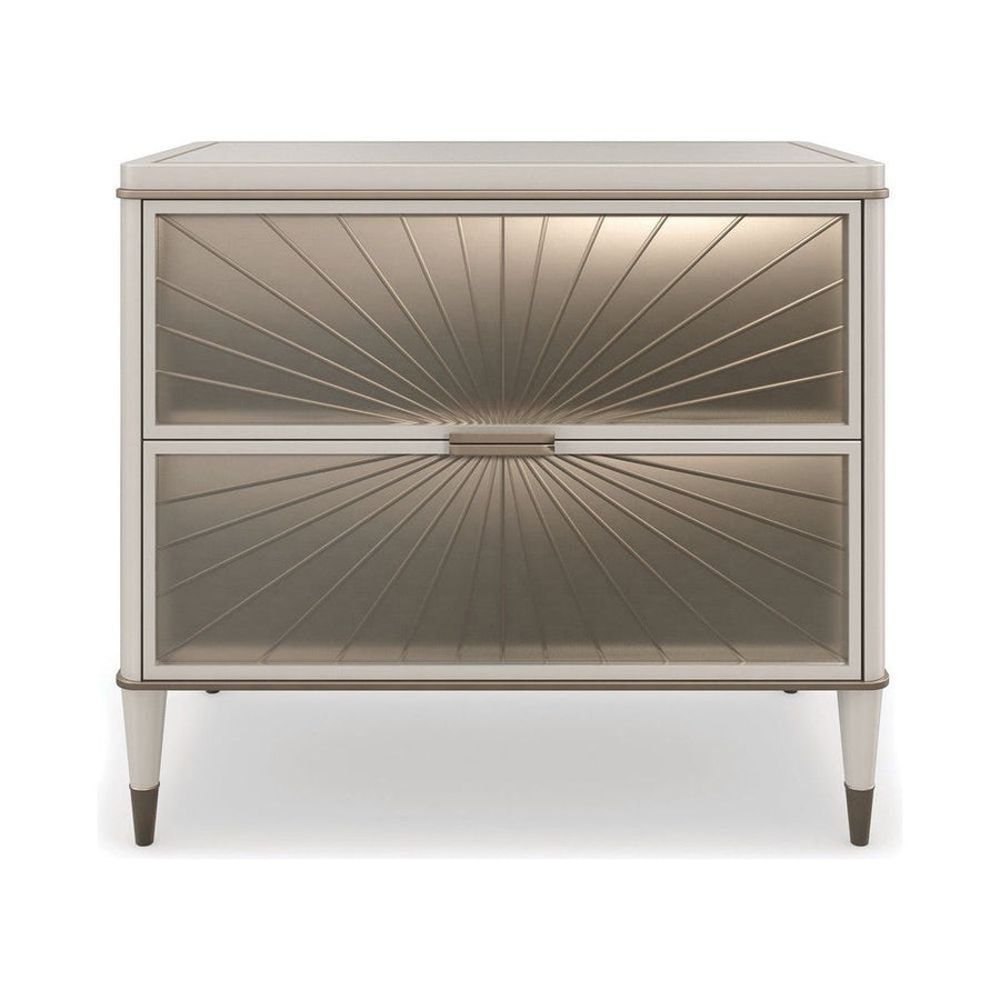 Features: Case in Matte Pearl.Top pinstripe and case molding in Golden Shimmer.Two drawers with fronts in etched back painted glass in Golden Shimmer with V cut pattern and soft close side guides.Metal ferrules in plated Bronze Gold metal.Drawer interior in UV Linen.