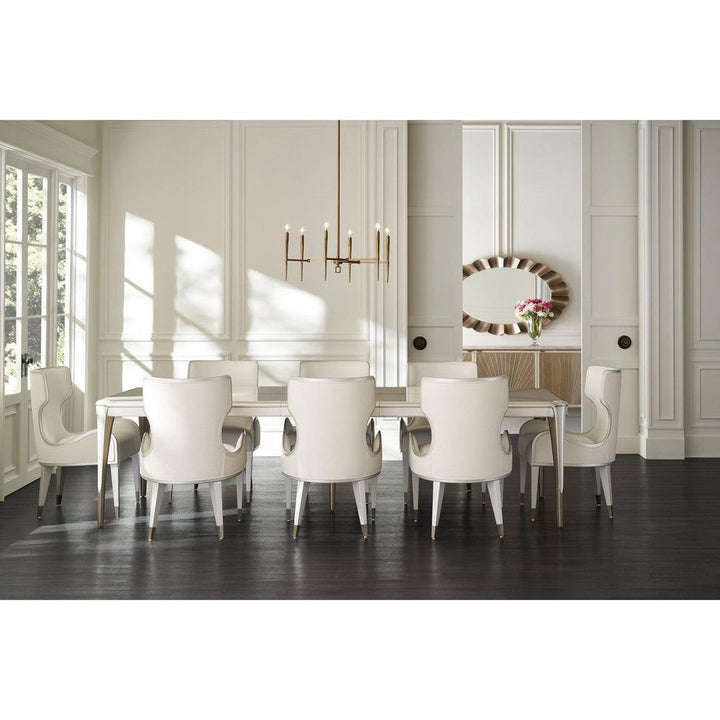 Elevating any occasion, the Valentina arm chair introduces a soft, sculptural silhouette, with low profile arms and a comfortably rounded back, accentuated by exposed wood trim in a Matte Pearl finish. Made for entertaining and gathering with friends, Valentina is impeccably dressed in a cream and gold textural woven that's easy to clean.