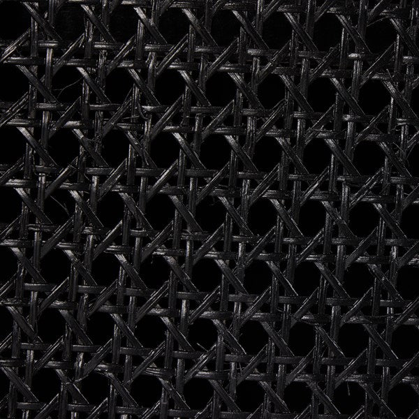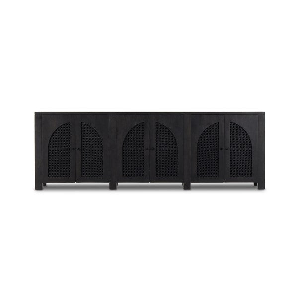 Grand in scale and presence. Black-washed mango encases arched cane door panels featuring black-finished iron hardware, meeting a forward-thinking material mix with monochromatic vibes.