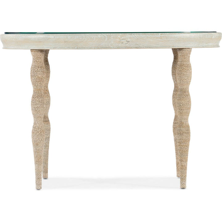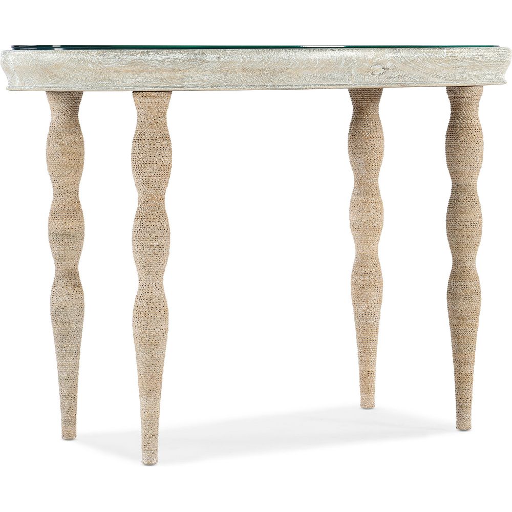 - Finish:Surf: light, airy whitewashed oak. Neptune: whitewashed rope wrapping. Painted glass top in blue and yellow tones. Distressing includes sandblasting and wire brushing.