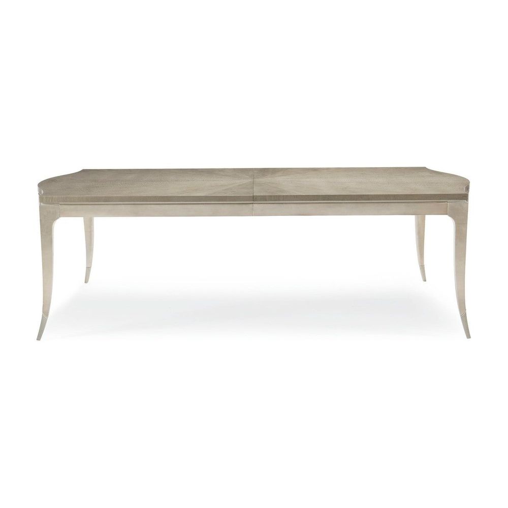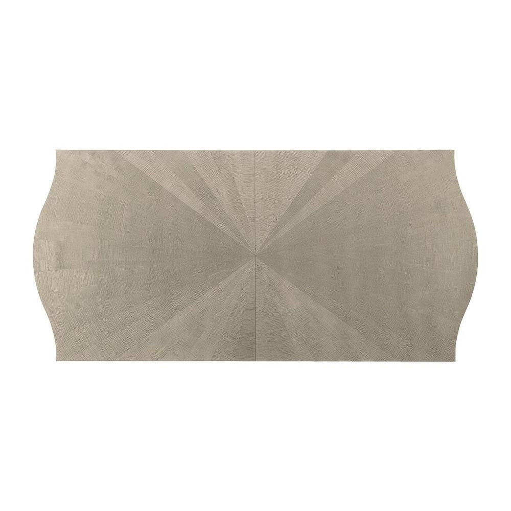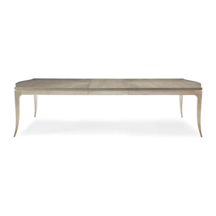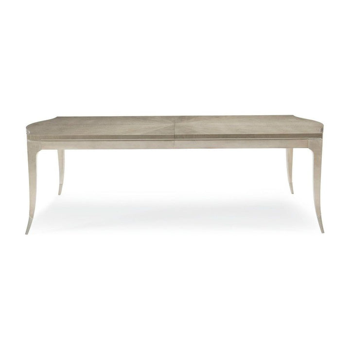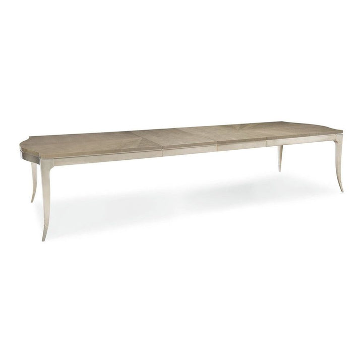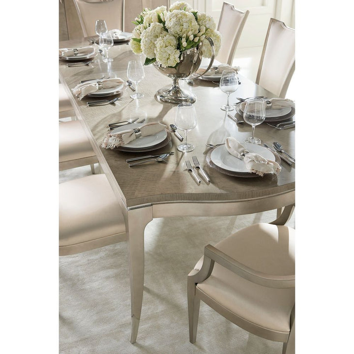 Set the table, set the mood with this elegantly shaped dining table. Its Silver Curly Maple top wears a Moonlit Sand finish while its legs and apron are highlighted with Soft Silver Leaf. Smartly designed to expand for entertaining, this gracious table boasts a finished length of 144 inches with the addition of its two 24-inch leaves. Metal ferrules add a distinctive finishing touch to its legs.