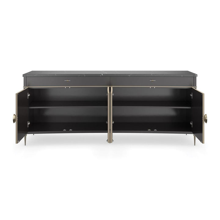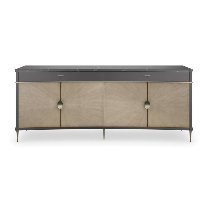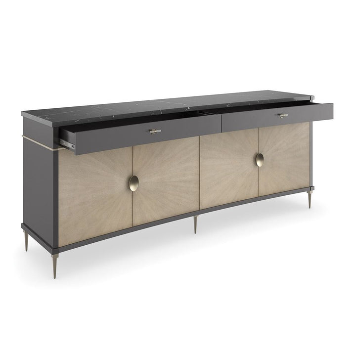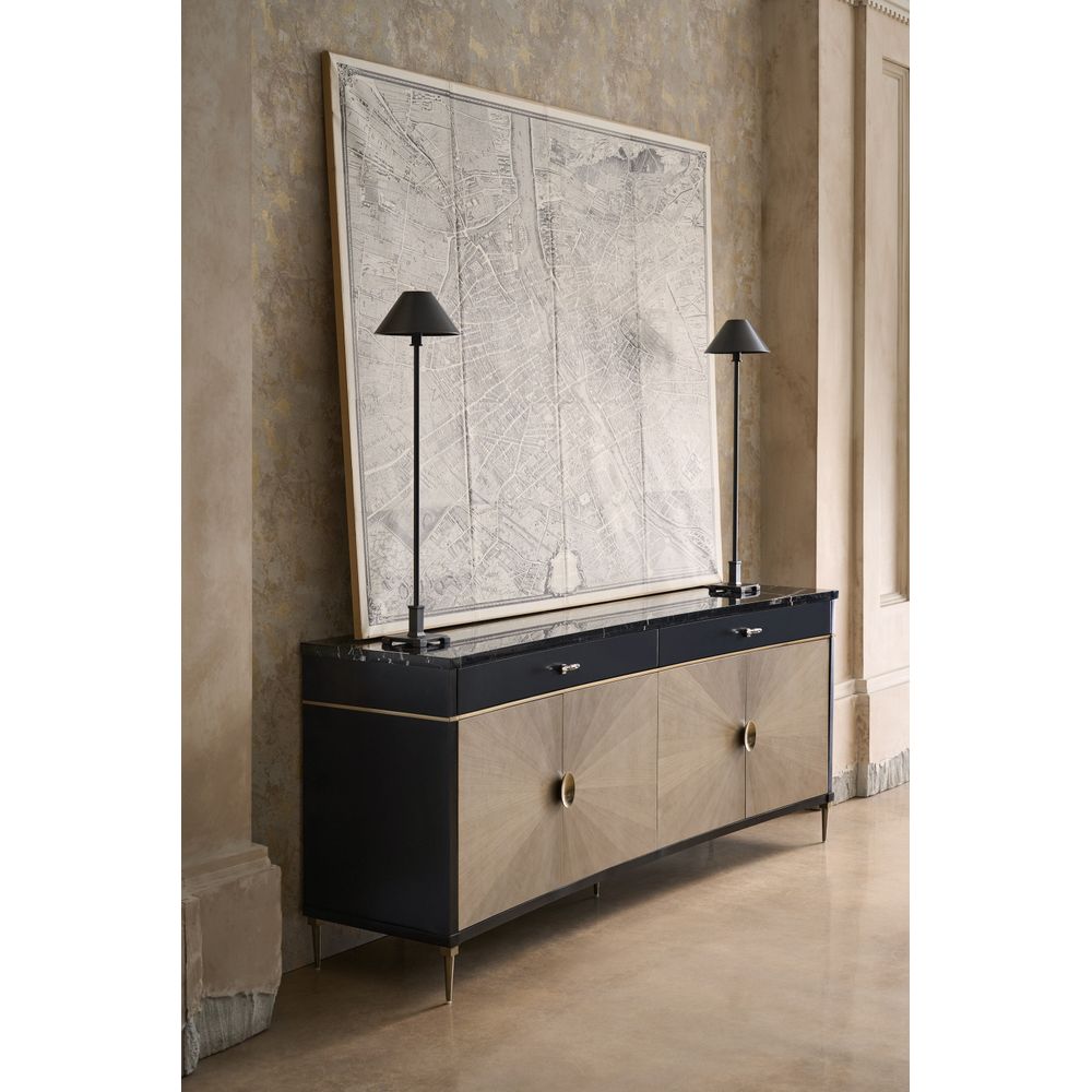 A contemporary take on French design and the Directoire style, this buffet brings a Neoclassical architectural presence with its clean shapes and decorative veneers. Punctuated by an Almost Black finish and Brushed Gold accents, it features radiating door fronts in Gray Gables to highlight the intricate wood grains of elegant Tiger Maple. A black marble top adds depth and a luxe yet durable surface for serving and display.