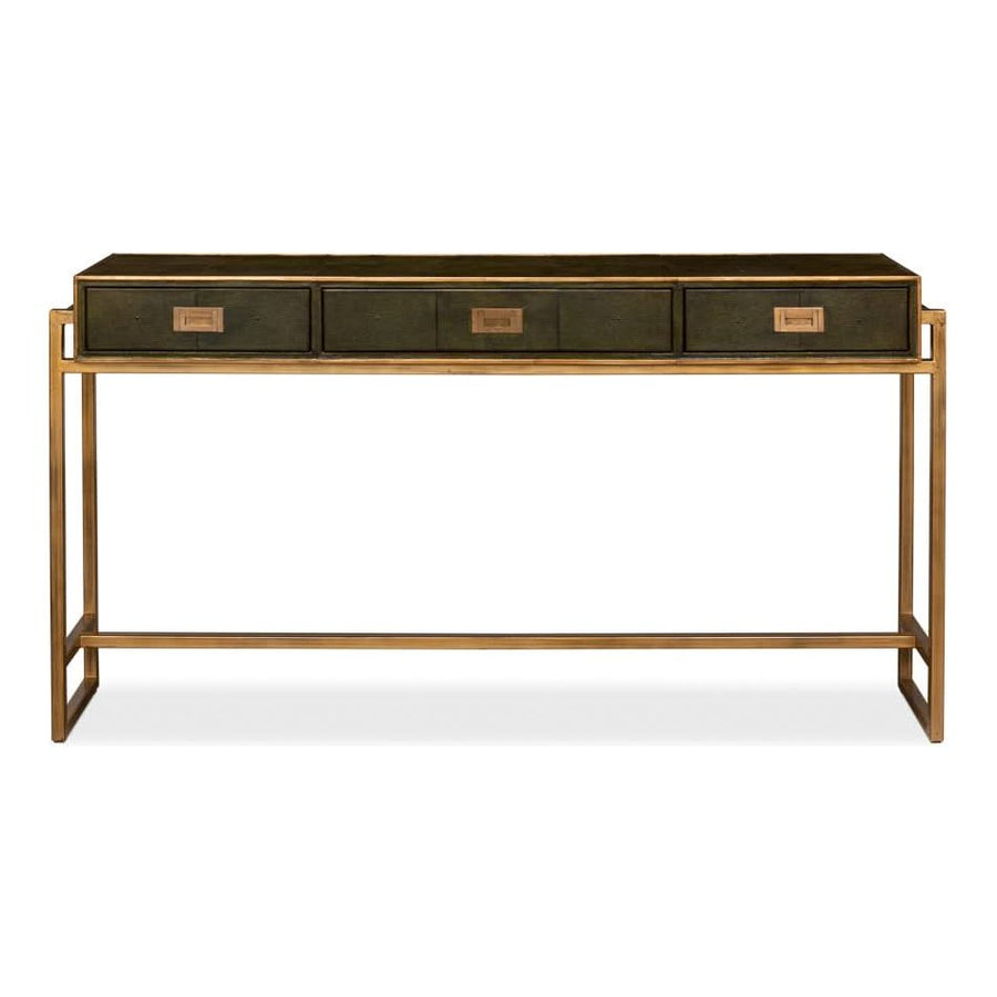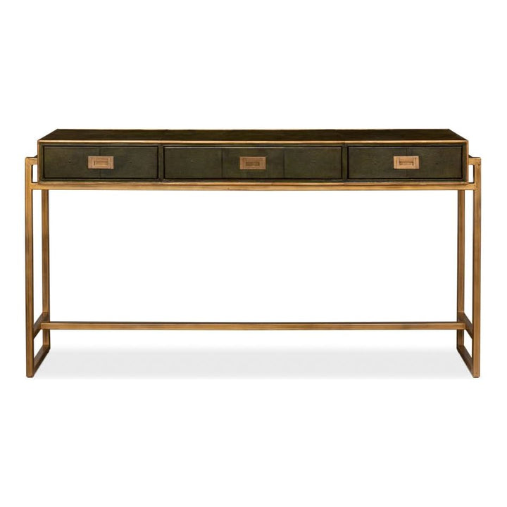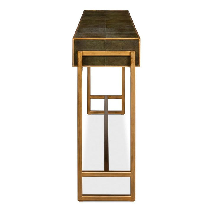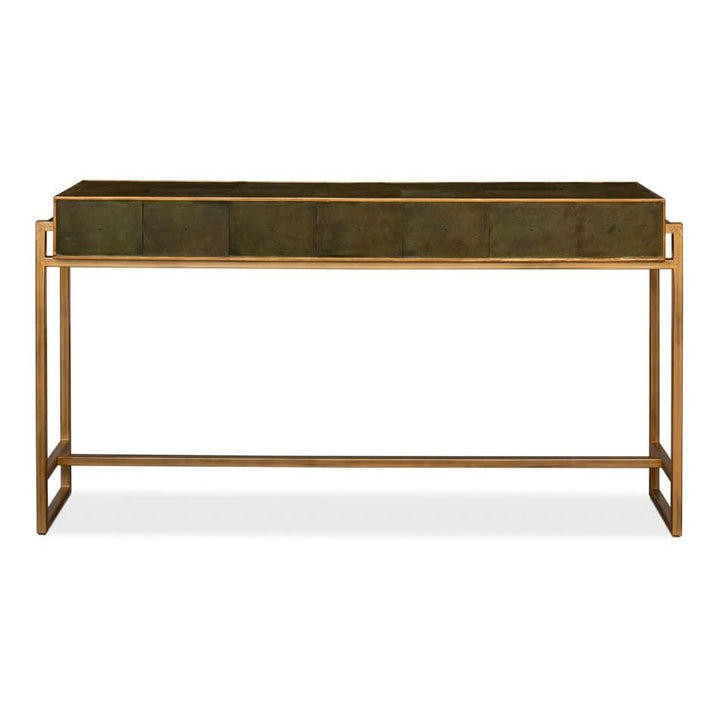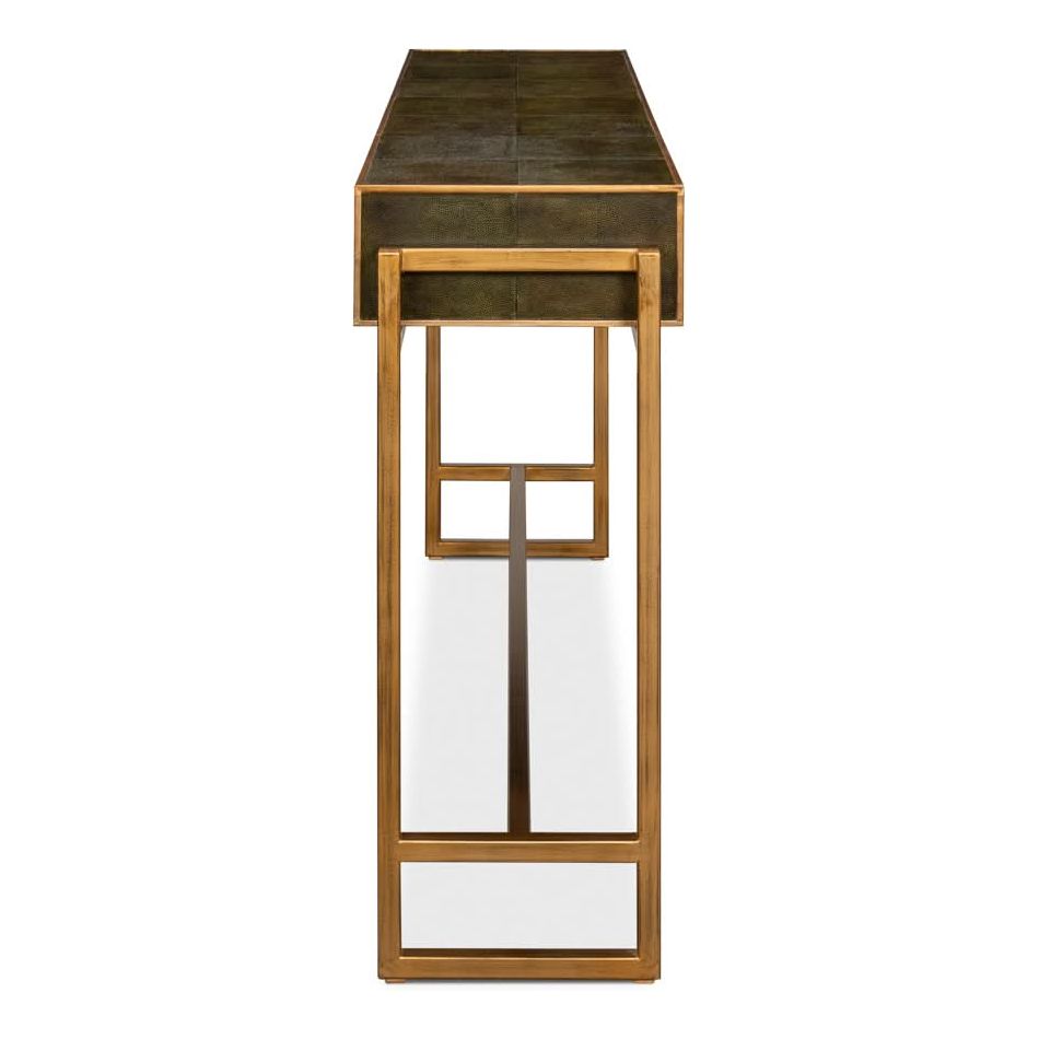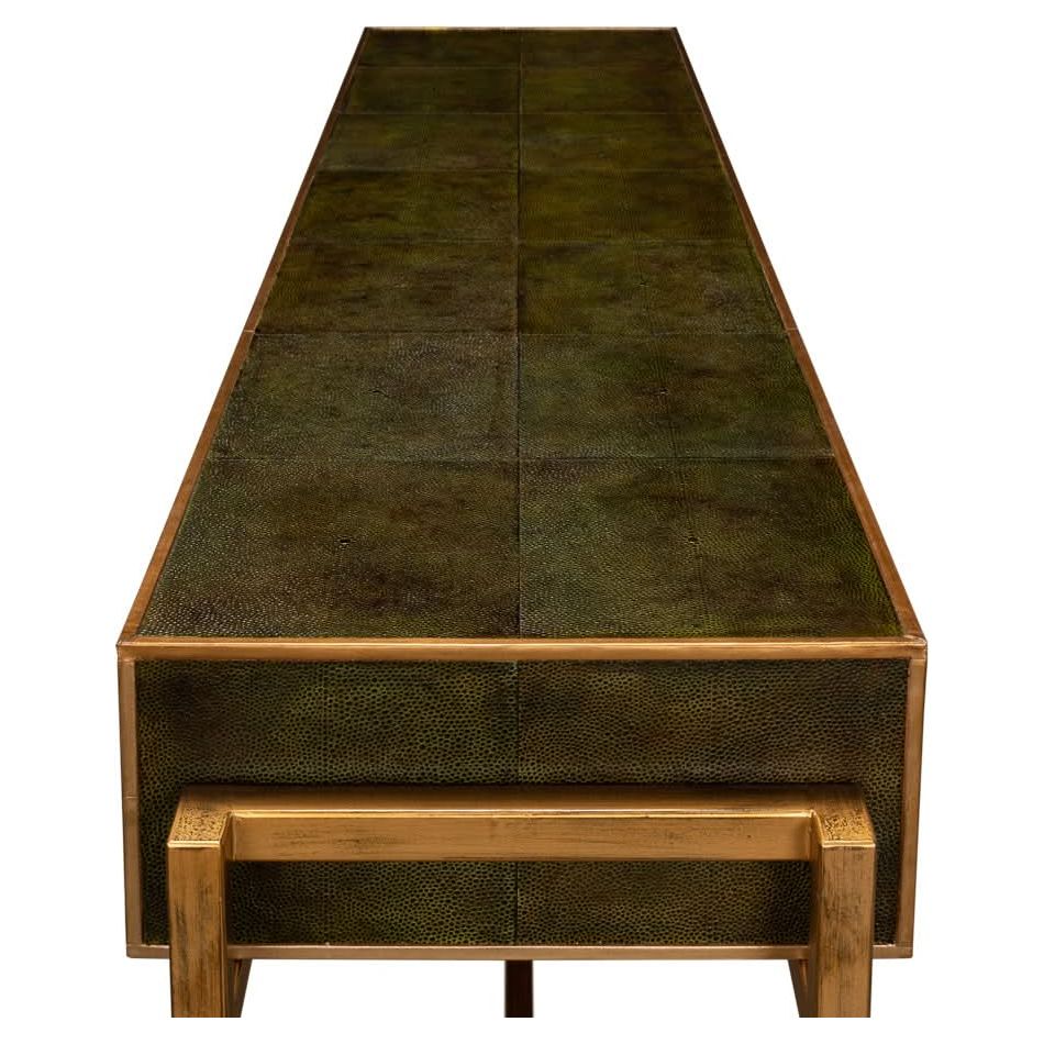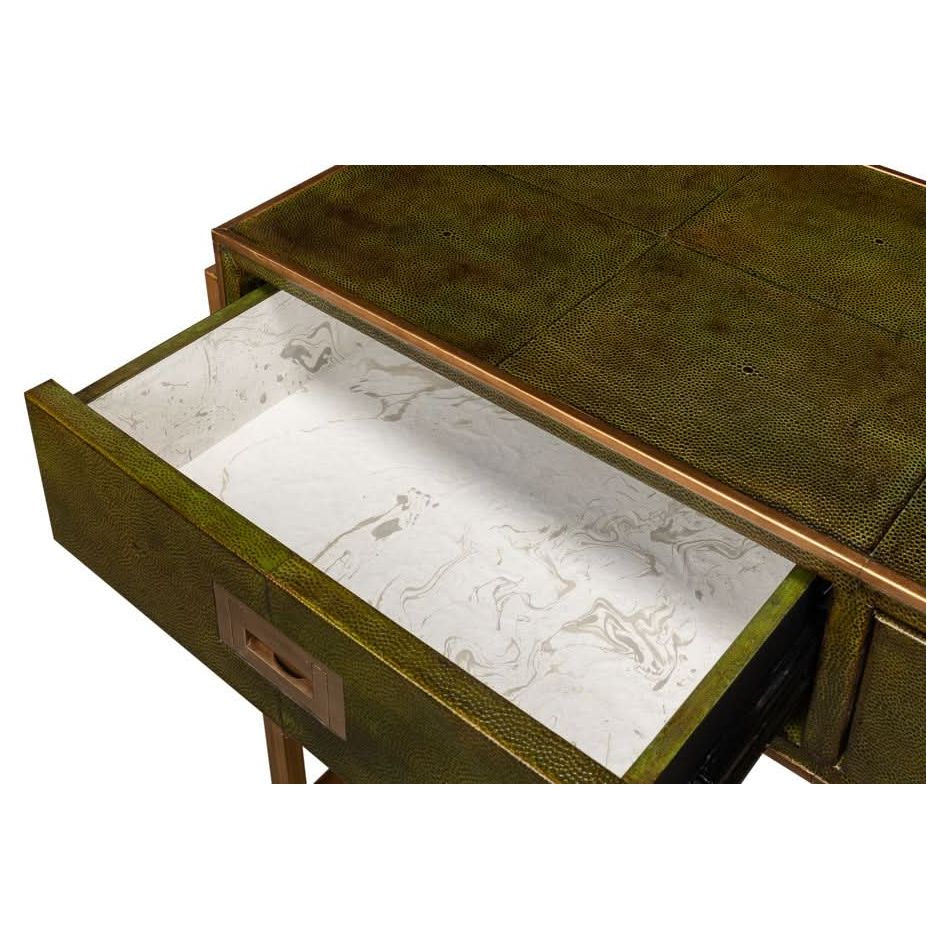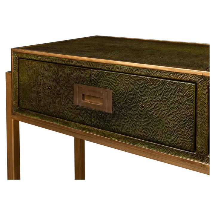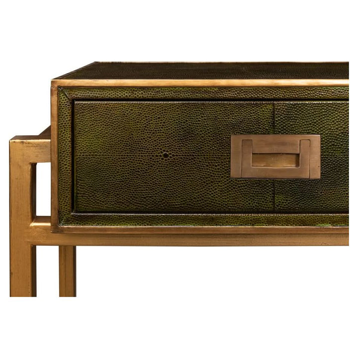Elevate your love story with the Shagreen Console Table in Leaf Green. Featuring brass hardware, contemporary design, and leather accents, it"s where romance meets modern elegance.