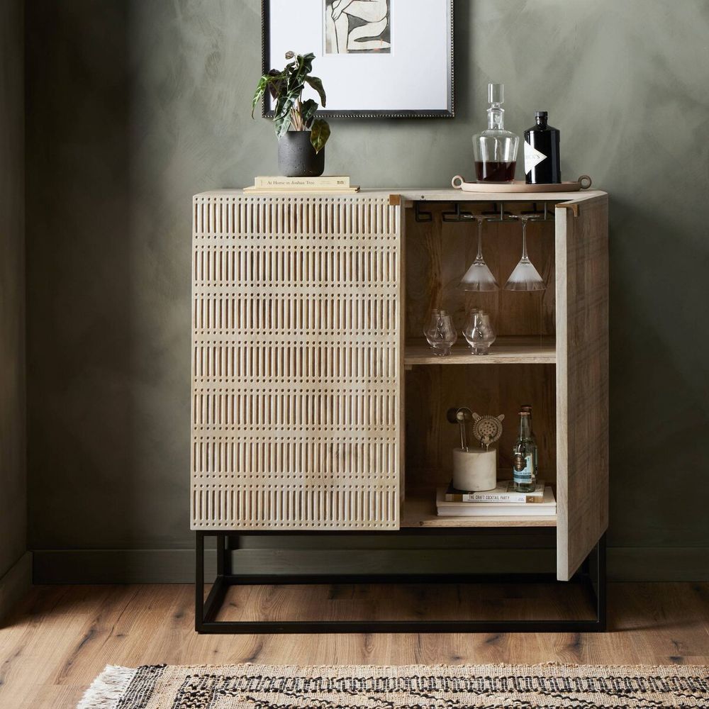 Uniquely carved light-washed mango wood highlights both texture and craftsmanship. Paired with a slim iron base to bring an airy, cage-like look to contemporary bar storage. Inside, spacious open shelving and stemware holders await.