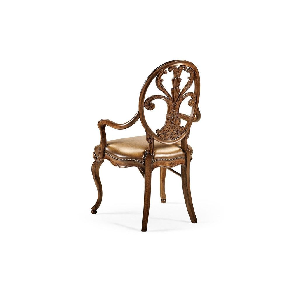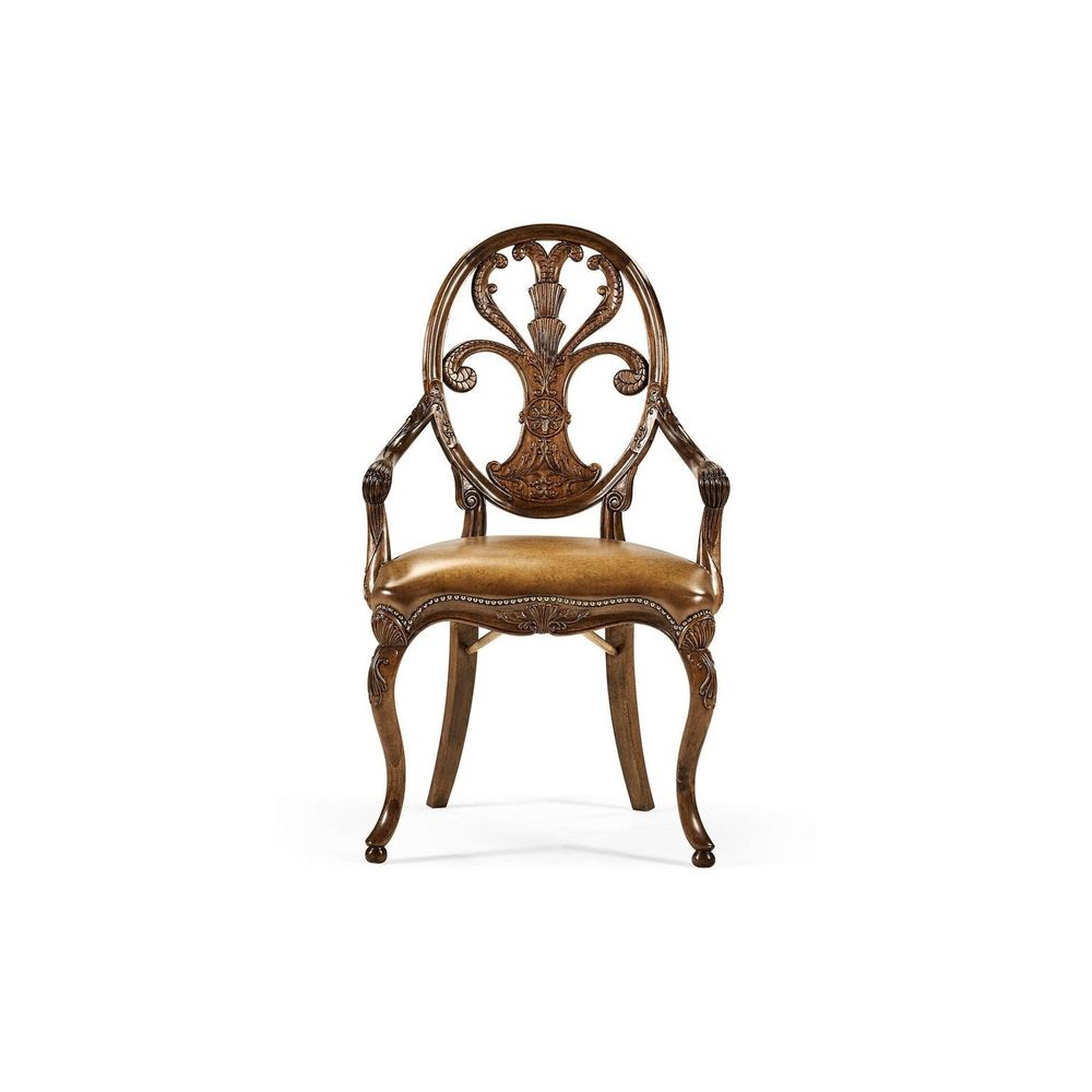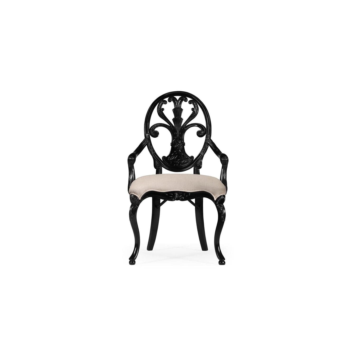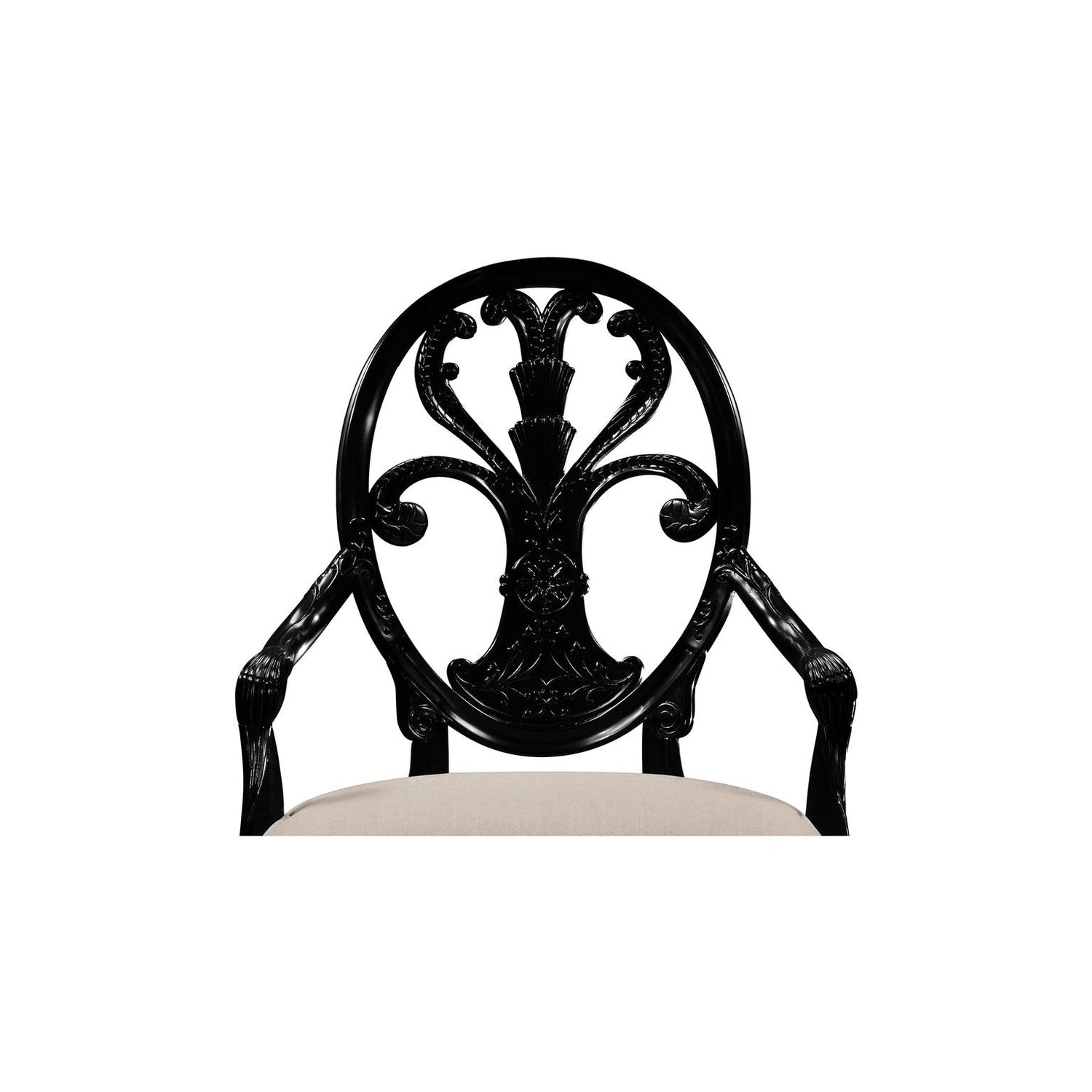 Sheraton style black painted dining arm chair with an open oval back, the splat with decorative neoclassical carving and a fleur-de-lys type ornament. Neutrally upholstered seat, and further shallow carved floral designs to the serpentine rail and cabriole legs terminating in a ball foot. After an original of c.1795.