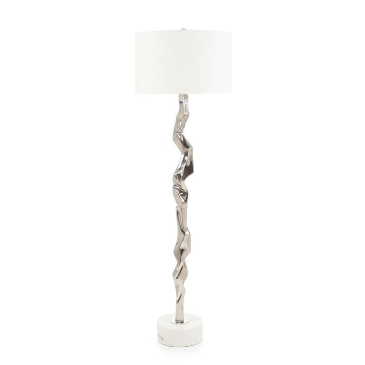 The geometric sculptural nature of this polished silver floor lamp is a stunning additional to any home. This floor lamp is placed on a base of white marble.