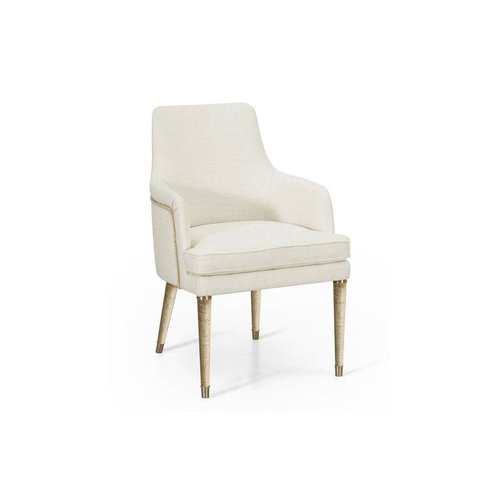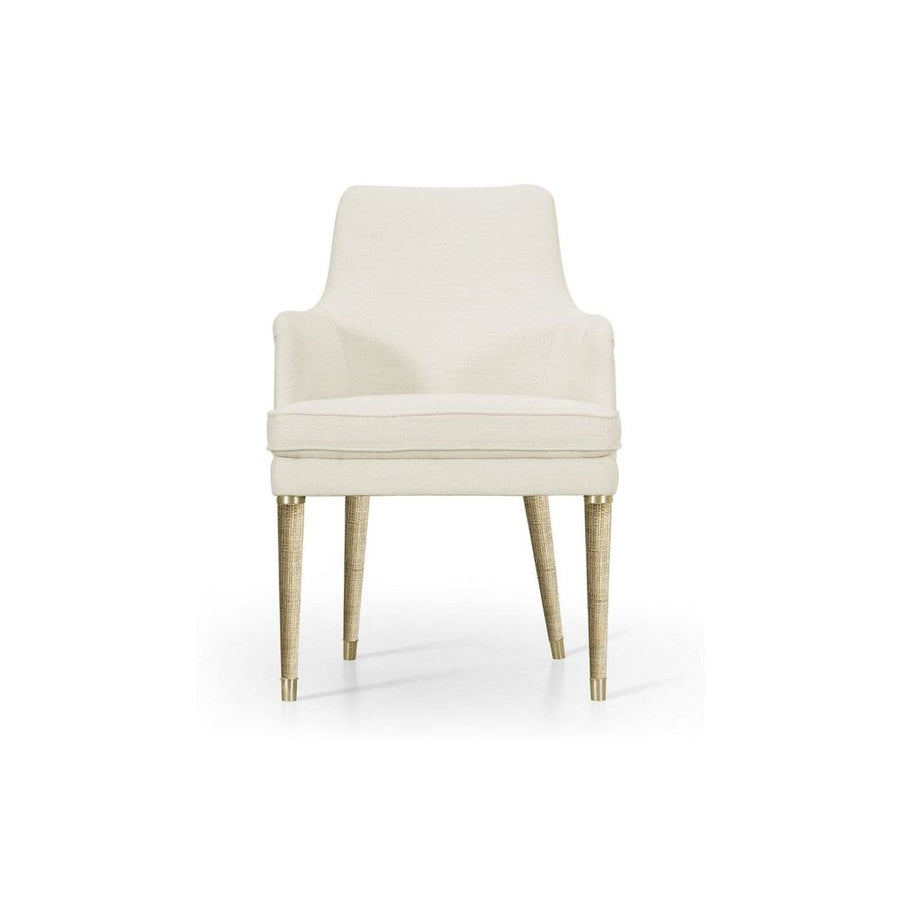 Uninhibited focus on timeless design, tested durability and supreme comfort is at the root of Jonathan Charles' shoal grasscloth host chair. Upholstered in a performance Magnifique fabric with grasscloth welt, this dining chair is supported by stylish legs wrapped in grasscloth with stainless steel collar and ferrules in satin white brass finish. Perfect luxuriating dining experiences in modern tropical interiors.