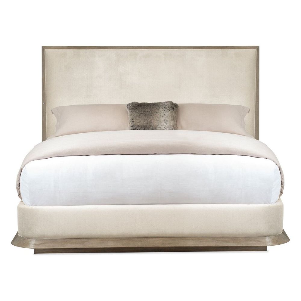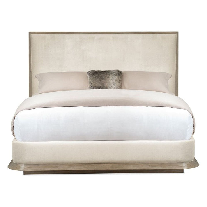 Elegant simplicity starts here. With every detail thoughtfully considered, The Stage is Set bed embodies the new look of inspired luxury. Its tall upholstered headboard is tailored to perfection in a stunning neutral fabric and outlined in a wood frame. An easygoing Ash Driftwood finish highlights the headboard's wood trim and the platform base of this impressive creation. Classic in every way, this is the bed that lets you dress it up or down whenever the mood strikes.