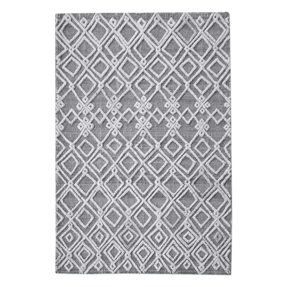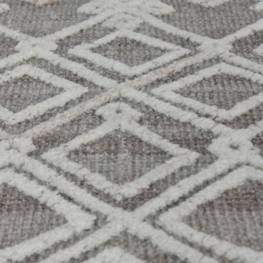 Woven natural gray wool, featuring an ivory, over tufted, tribal inspired design