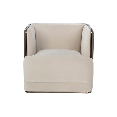 A bold form defines this modern and structured armchair that is guaranteed to turn heads. Features an interior upholstered in meg taupe fabric and an exterior in textured porcini taupe faux leather. Completed with an antique bronze stainless steel frame. Coordinating sofa also available. Handle With Care: This design has been crafted with faux leather. Faux leather is manufactured to reflect the natural characteristics of leather; as such, colour variations, markings wrinkles, grooves, and light scratches are appreciated characteristics. No two pieces will be alike. Visit our Product Care page for more information on how to ensure the lasting beauty of this piece.