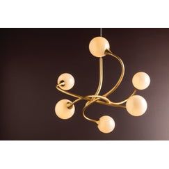 With its fluid silhouette and antique Gold Leaf finish, Signature offers a brilliant take on modern artisan effect. Delicately hand-crafted arms gracefully clutch white pearl-like shades, giving depth, beauty and texture to any space.
