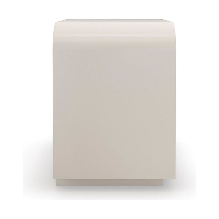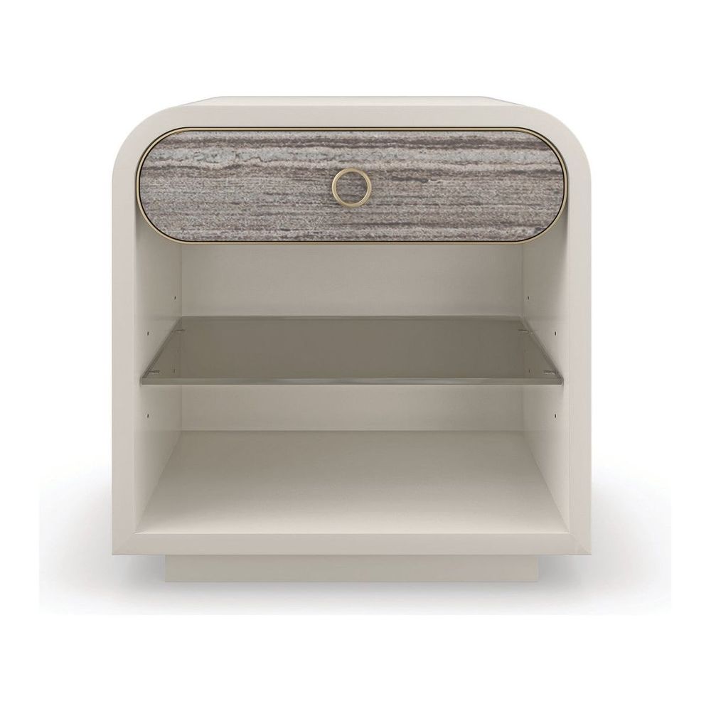 Fundamental in form and function, Quarry draws attention with its compelling mix of texture and material. Features a single drawer, crafted from polished gray sandstone framed in metal and minimally adorned by a small ring pull in Champagne Gold. Offers ample open space with a smoked bronze glass shelf for keeping nighttime reads and decor. An Almond Milk finish adds soft contrast in a creamy neutral hue.