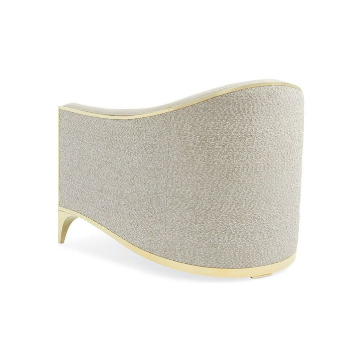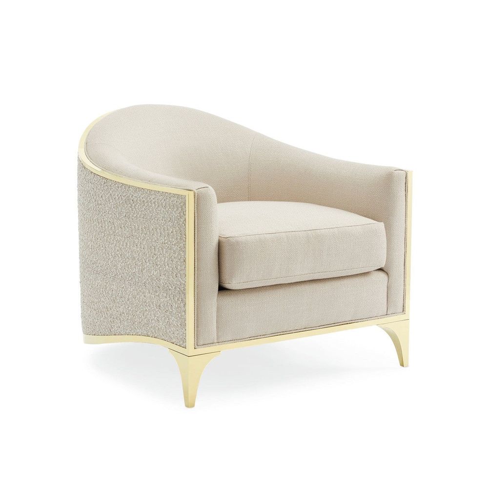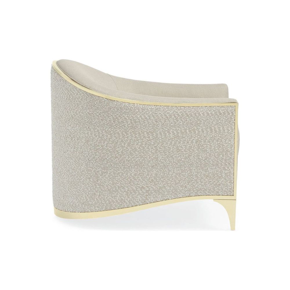 Our elegant Svelte Chair is graceful in every respect and from every angle. Inspired by Italian design in the mid-century, this chair's extraordinary silhouette is simply breathtaking. This barrel chair is the epitome of refined beauty. Its top rail gently slopes forward while its base gracefully sweeps downward from its sculptural Majestic Gold front legs to balance on the floor in the back of the chair. The chair's interior and loose seat cushion feature a shimmering basketweave fabric in a lovely Moonstone hue while the chair's exterior is meticulously upholstered around its barrel back in a tone-on-tone novelty eyelash embroidery. The exposed gold frame wraps the chair in just the right touch of brilliance. Try grouping four or more chairs around a circular cocktail table in a small den, or library for the perfect conversation area.