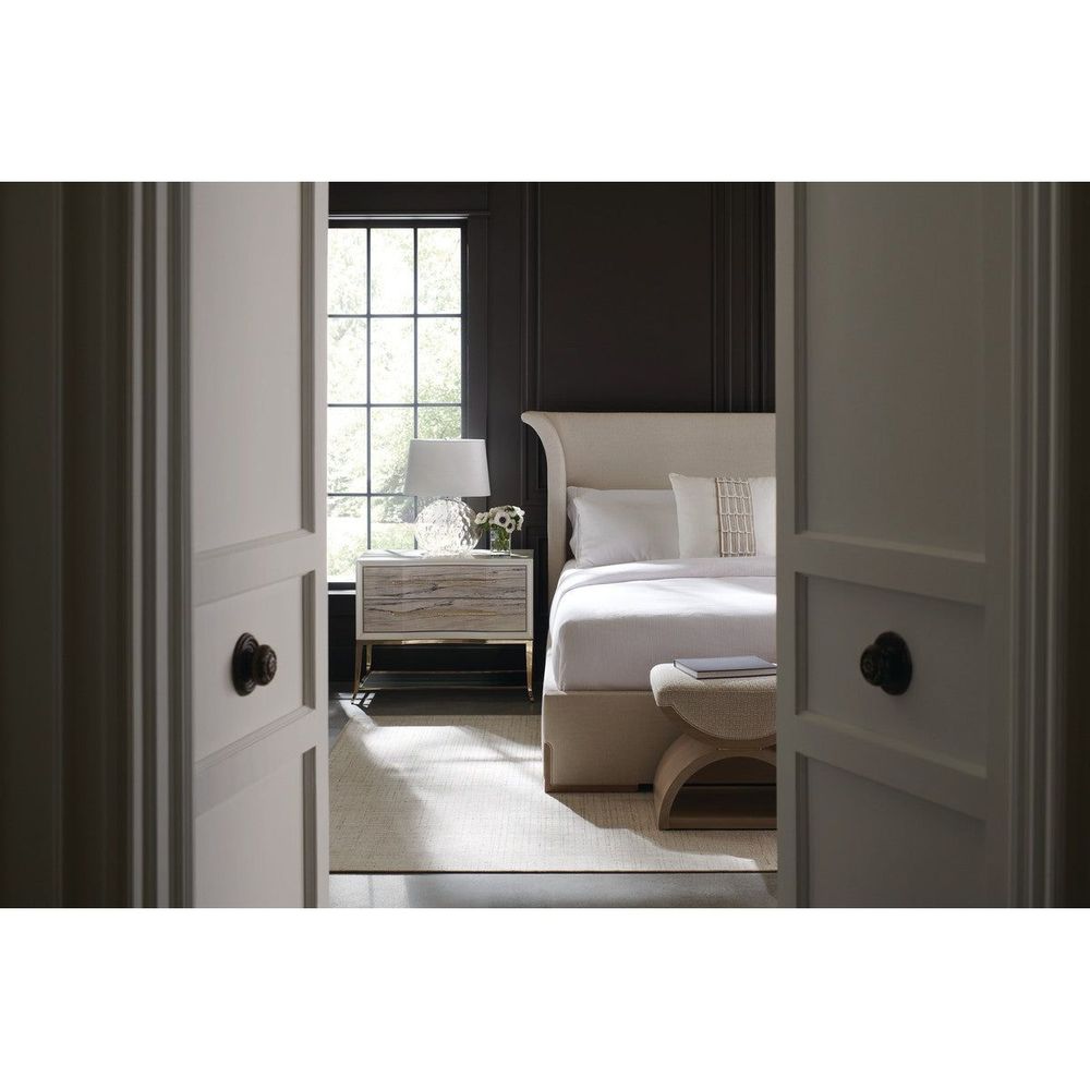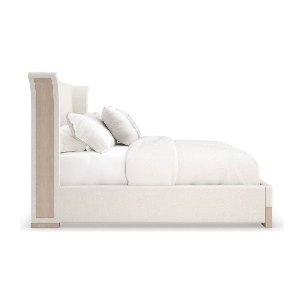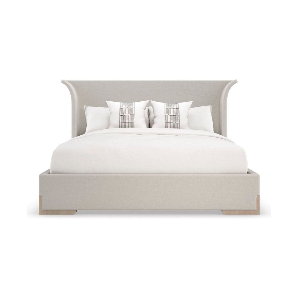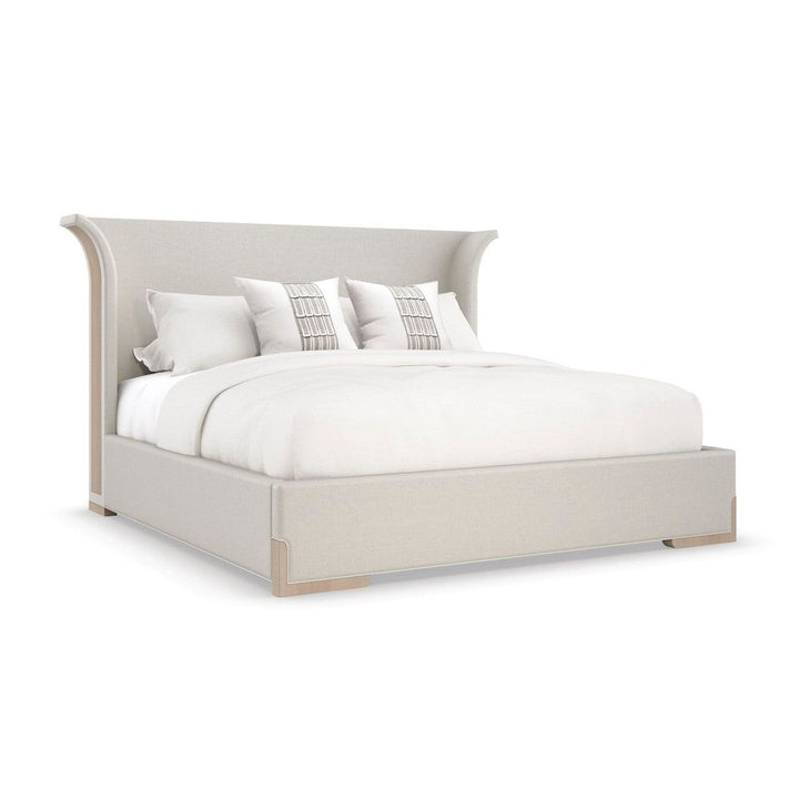 For those with a flair for the dramatic, this bed makes a captivating statement with its softly flared headboard shape. Gently arcing wings are warmly framed by inset panels crafted in Japanese Sen veneers, with matching feet seamlessly incorporated into the front rail. Fully upholstered in a shimmering performance fabric for the perfect complement to a tonal Woodland Gray wood finish. Brings a note of casual elegance to any bedroom interior.