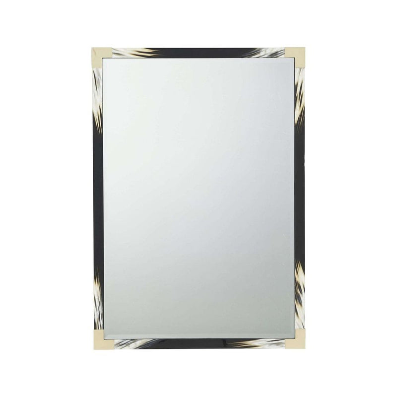 A black lacquered and faux horn mirror, the rectangular top with brass edged corners, enclosing a bevelled edge plate.