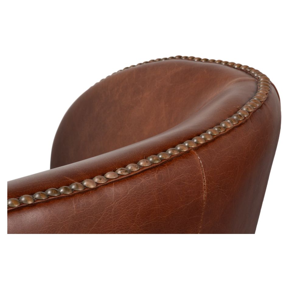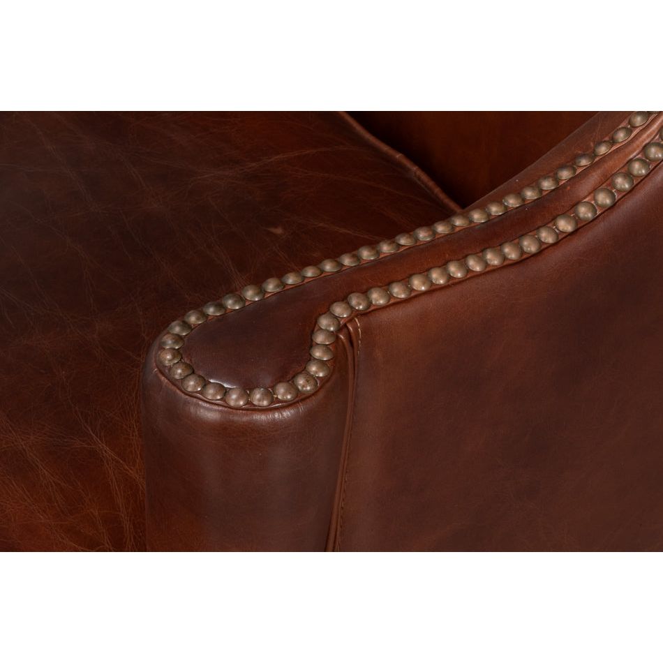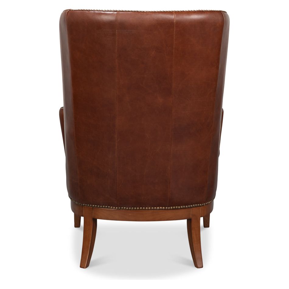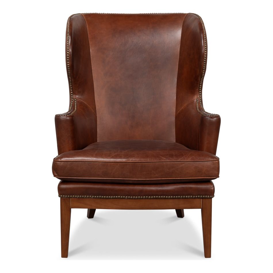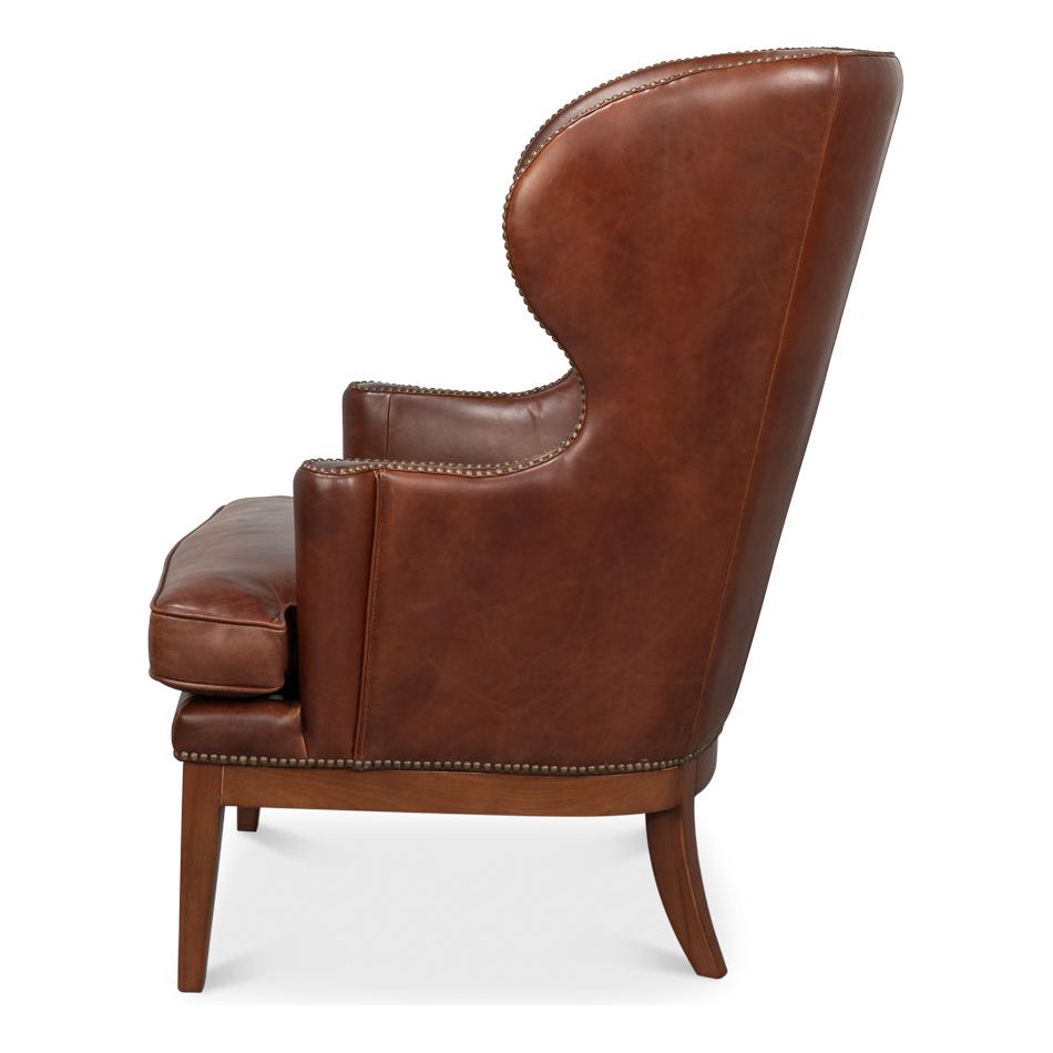 Description: The Smithfield Wing chair is destined to become an instant favorite, combining classic style with unparalleled comfort. Featuring exaggerated wings, flared arms with a vertical roll, antique brass nailhead trim, and a rich brown top-grain cowhide with a beautiful patina, it rests on a striking walnut base for a timeless, sophisticated look.