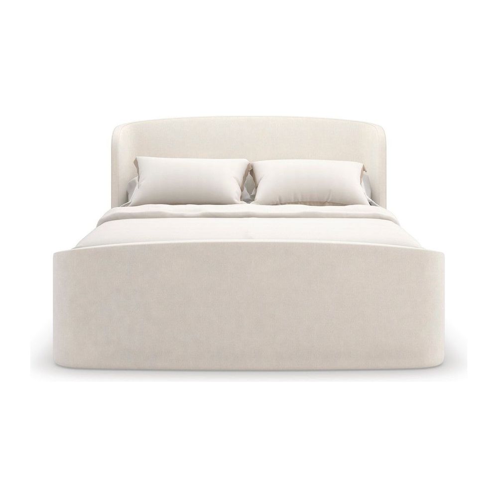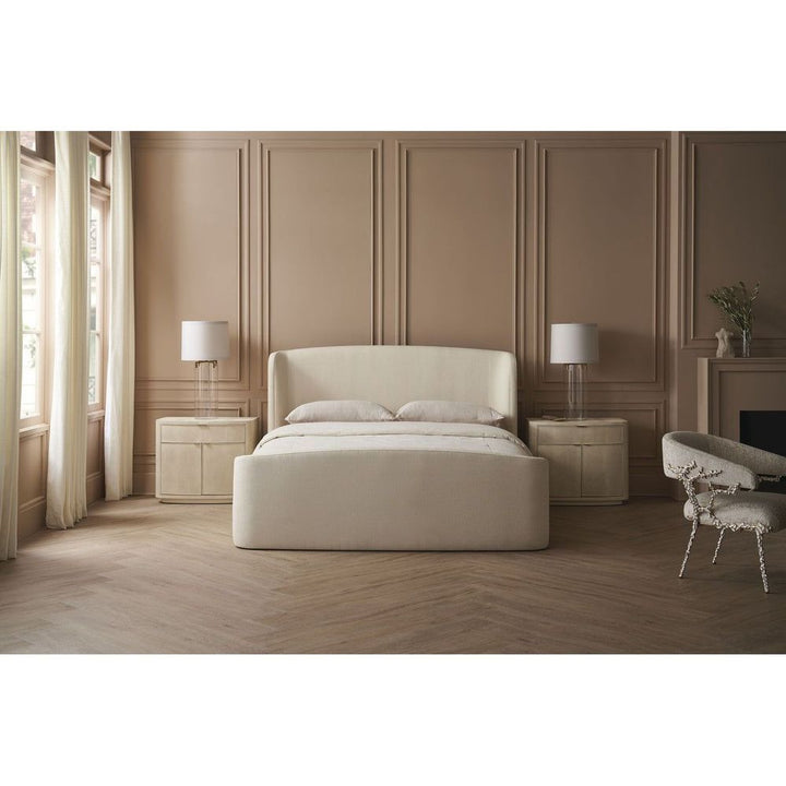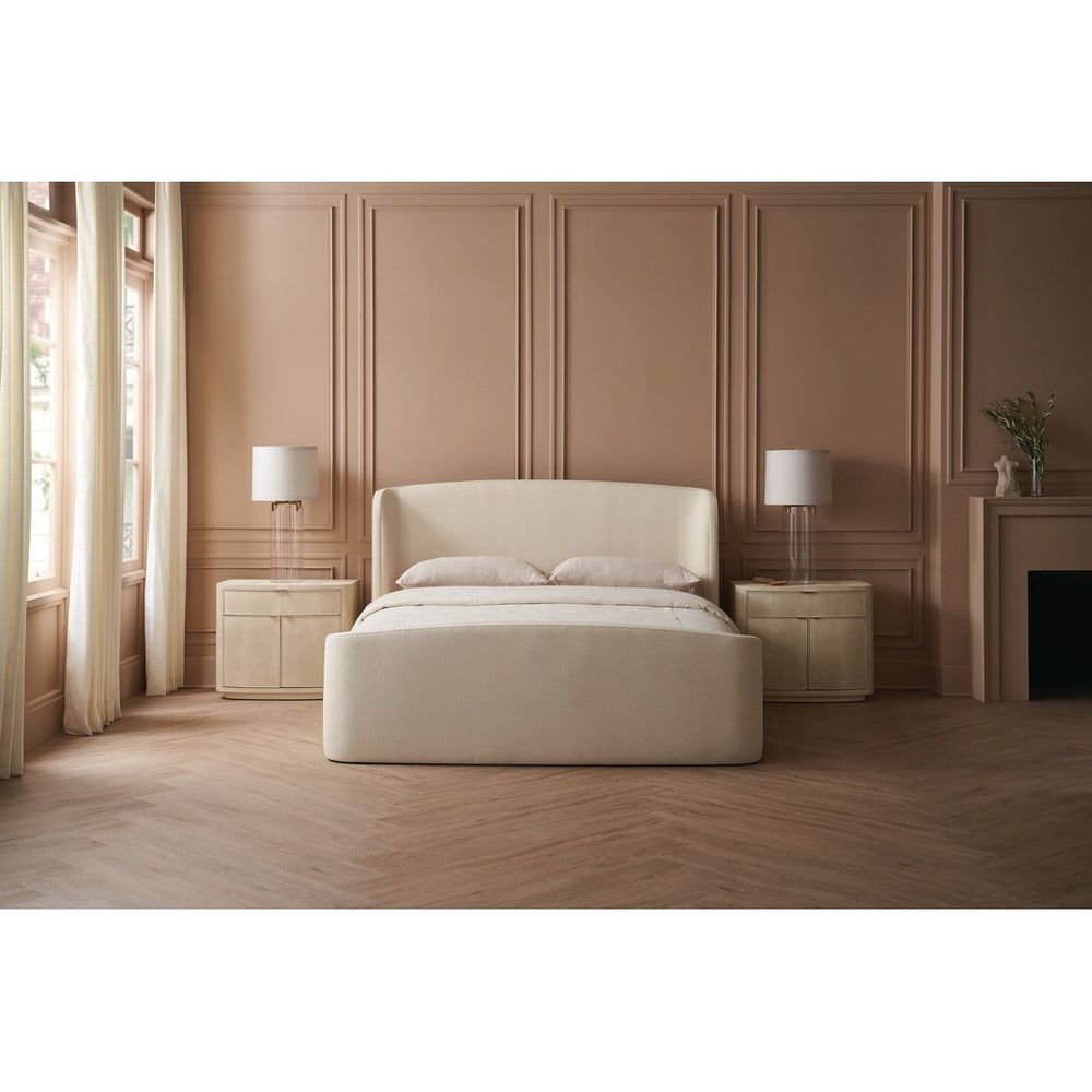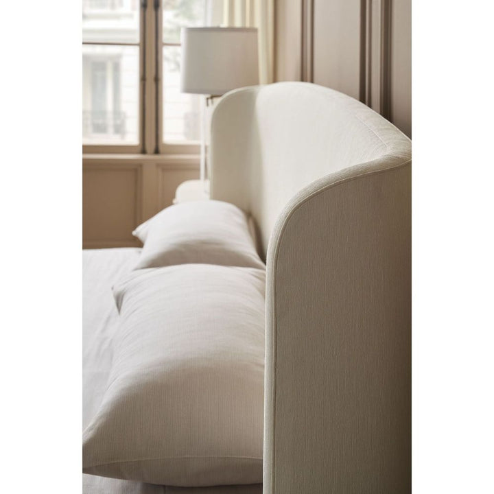 With an enveloping silhouette, the Soft Embrace bed evokes the naturally elegant form of a shell, found along the shore after eons at sea. Fully upholstered in an ivory ribbed fabric, it introduces a soothing hue and subtle texture to bedroom interiors. Its welcoming shape invites calm and pairs well with our Simply Perfect nightstand, as well as numerous other case pieces in our collection.