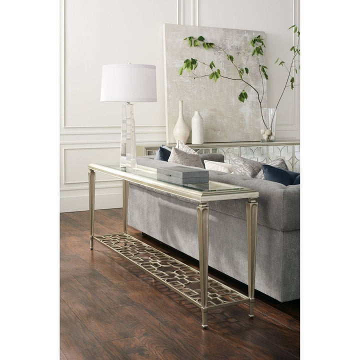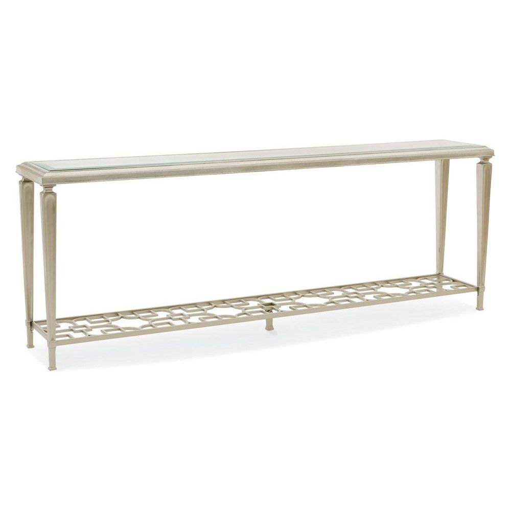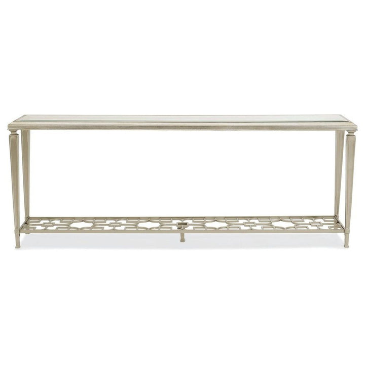 Open and alluring, this distinctive console table makes a bold statement. Its airy design is elegant in its simplicity and features an exquisite metal fret-patterned shelf that can be seen through its glass top. Tall metal legs reach skyward and support its clear glass top with 1 " bevel. Finished in Taupe Paint and Taupe Silver Lear, it's perfect for behind a sofa or anywhere you need a touch of elegance.
