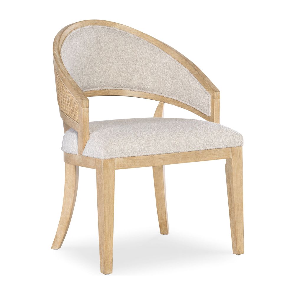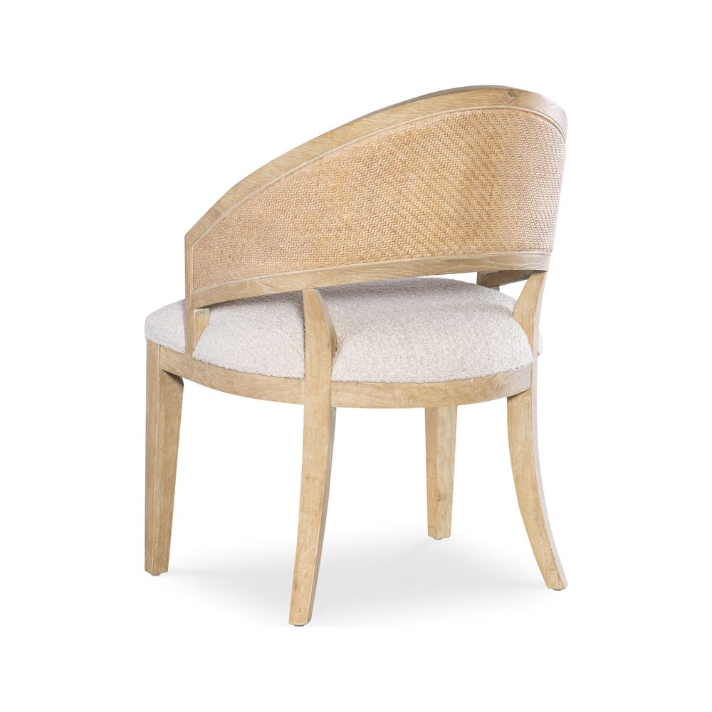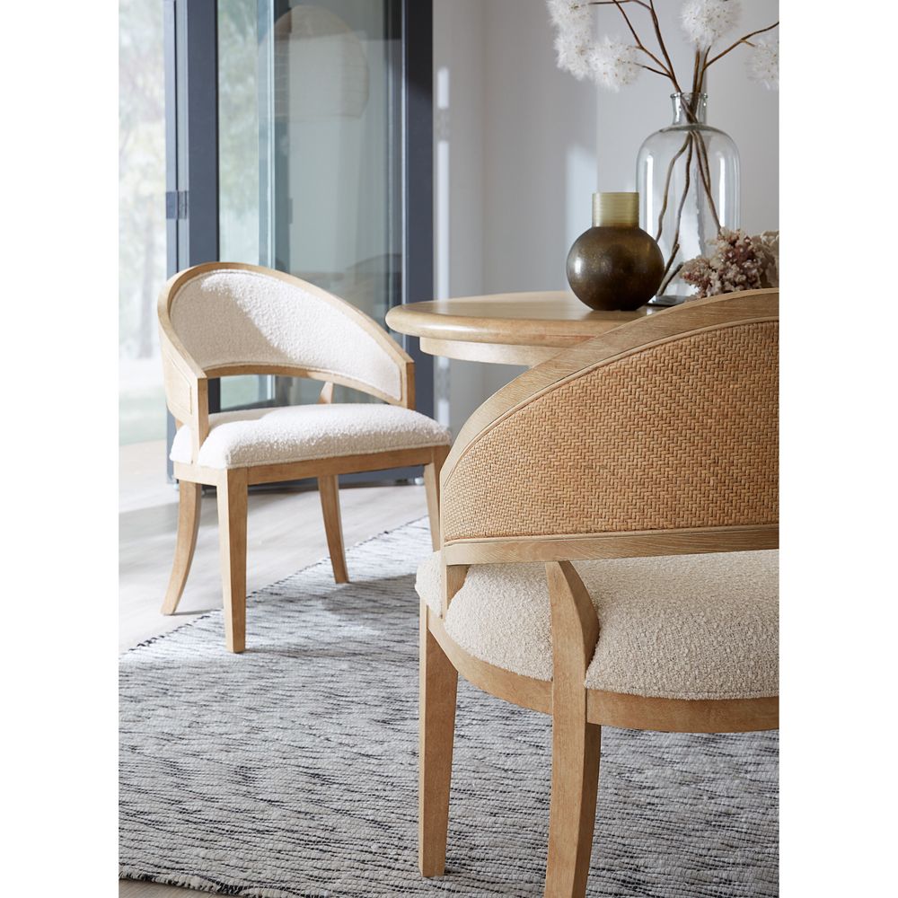 Description: Offered in a modern yet timeless barrel-style back silhouette, the versatile Solace Chair combines wood, cane and fabric in a chic organic design. The chair frame is finished in the sand-colored Dune, complemented by the Neo Cream performance fabric on the upholstered seat and back and raffia cane on the back of the chair back.