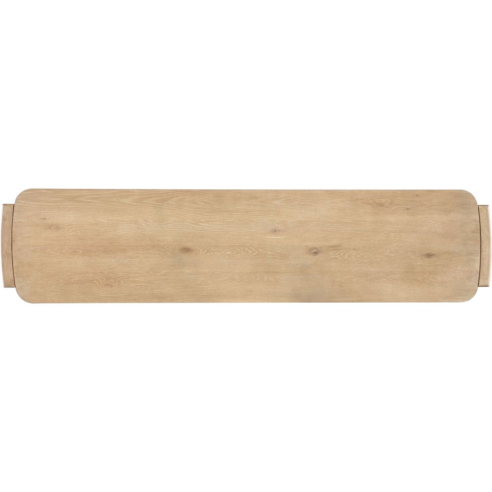 Description: The Solace Console Table has a tranquil personality with a modern twist. Simple, clean lines are in a rectangle shape with rounded corners and interlocking block-style legs. Crafted of Oak Veneers, it is finished in the sand-colored Dune, transparent by design to reveal the unique grain patterns of the wood veneer. One lower fixed shelf.