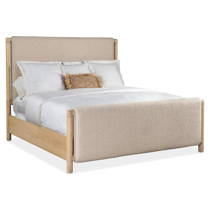Features: Includes headboard, footboard and rails; King size; Fabric upholstered headboard and footboard; Rope accents