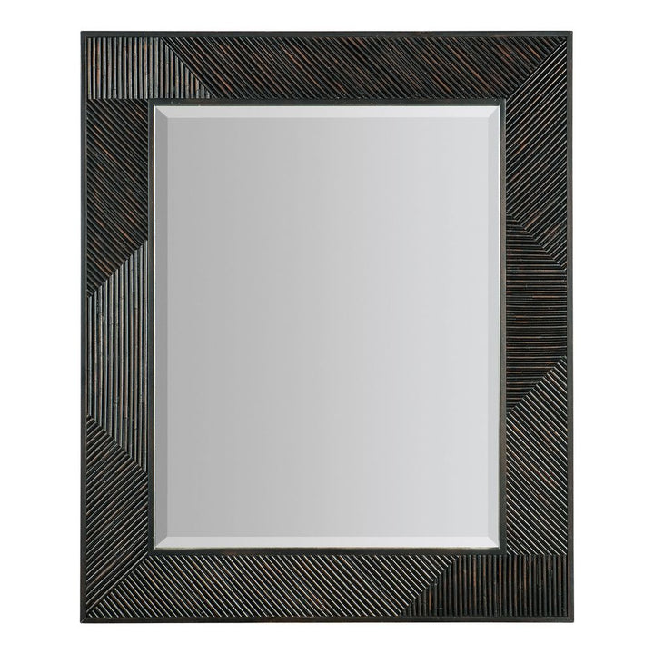 Description: Tactile and textured, the tropical retreat-inspired Solace Landscape Beveled Mirror is framed with carved resin in a reeded design. The mirror is finished in Black Sand, transparent by design to showcase the unique grain patterns of the wood veneers. In a rectangle shape, the mirror can hang either horizontally or vertically.