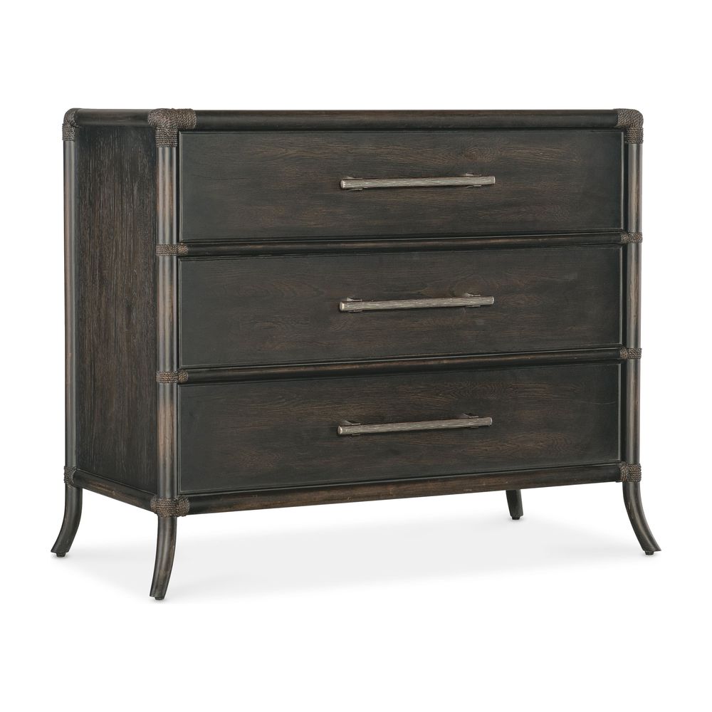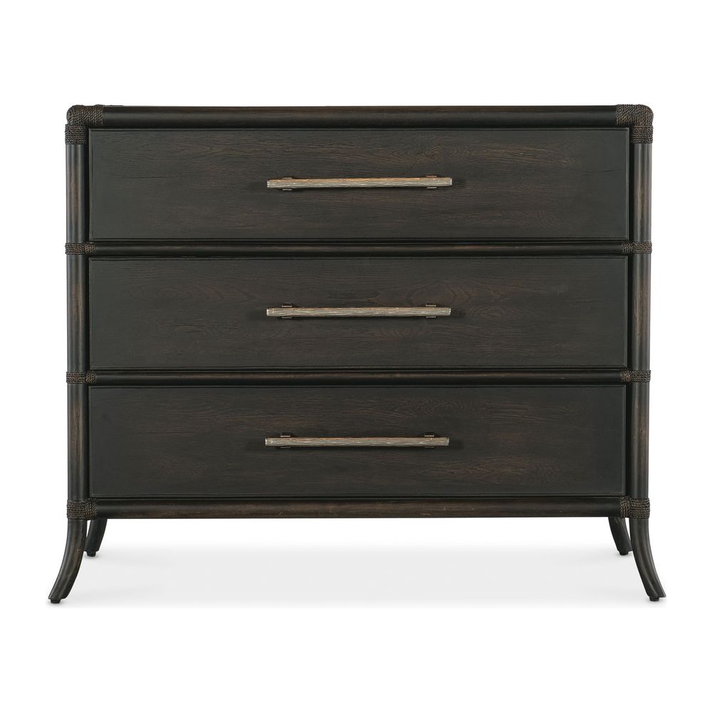 Description: Inspired by tropical getaways, the two-tone Solace Pole Rattan chest is a mixture of natural materials in a laid-back, versatile design. The two-tone finish contrasts the Black Sand finish on the case with the Seagrass green finish on the drawer fronts, accented by textured bar pulls in a soft pewter color. The chest is crafted of Bamboo and Maple Veneers with Rope accents. Three self-closing drawers.