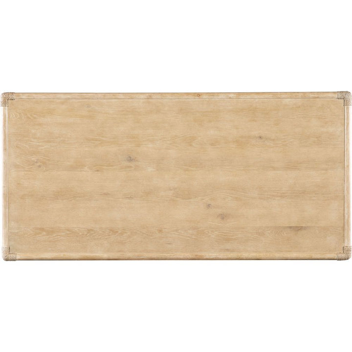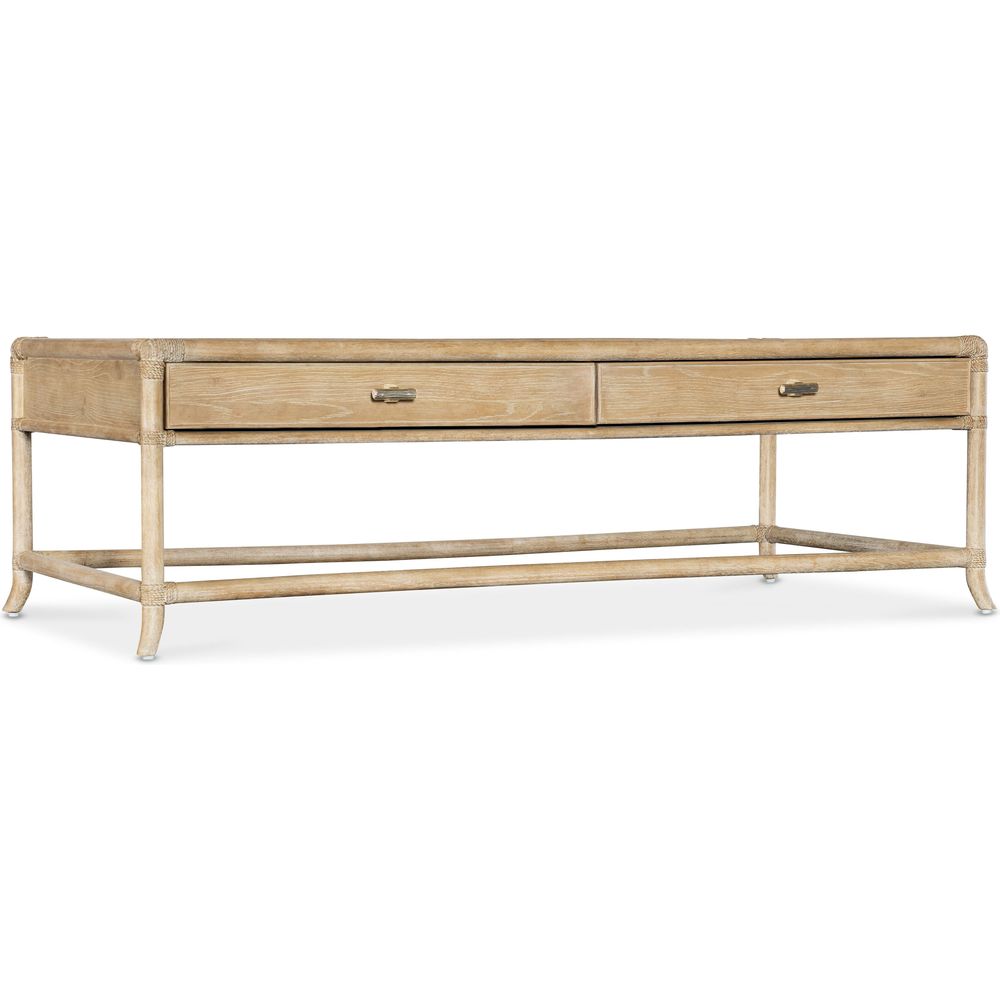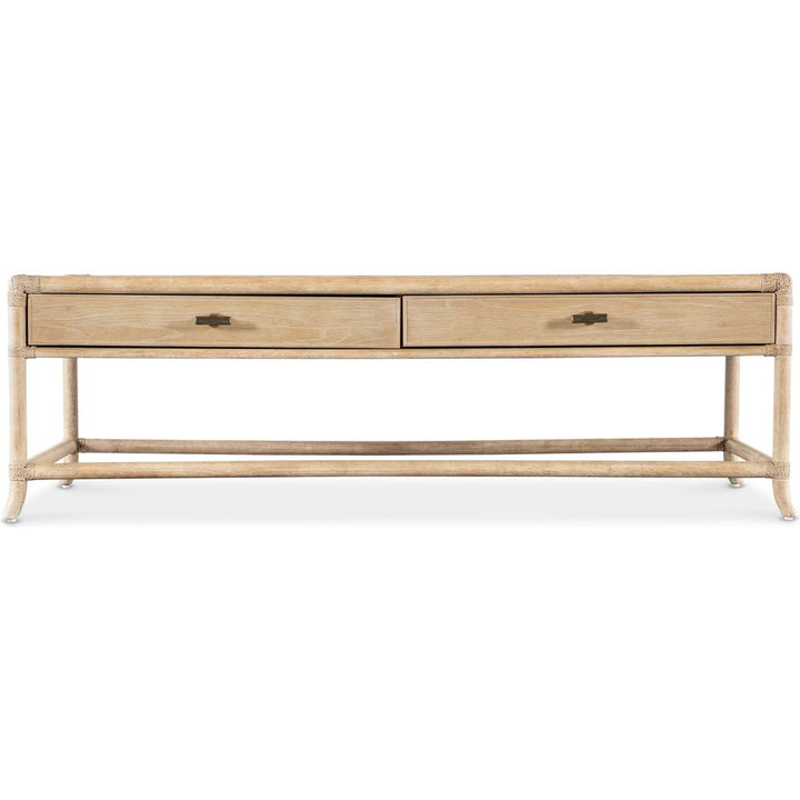 Description: Inspired by tropical getaways, the Solace Pole Rattan Cocktail Table is a mixture of natural materials in a laid-back, versatile design. Crafted of Oak and Maple Veneers with Rope accents at the joints, the table is finished in the sand-colored Dune, transparent by design to showcase the unique grain patterns of the wood veneer. Finished on all sides, the table has two self-closing drawers, lower stretchers on all sides and is accented by textured, pewter-colored "T" pulls.