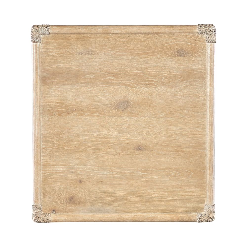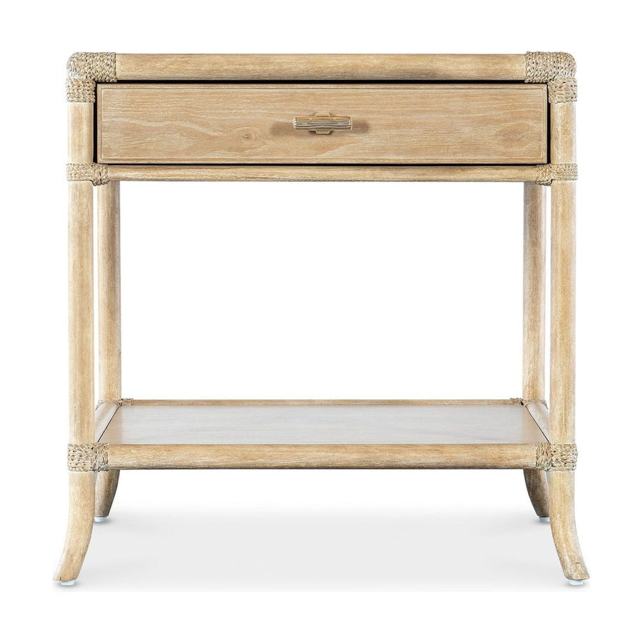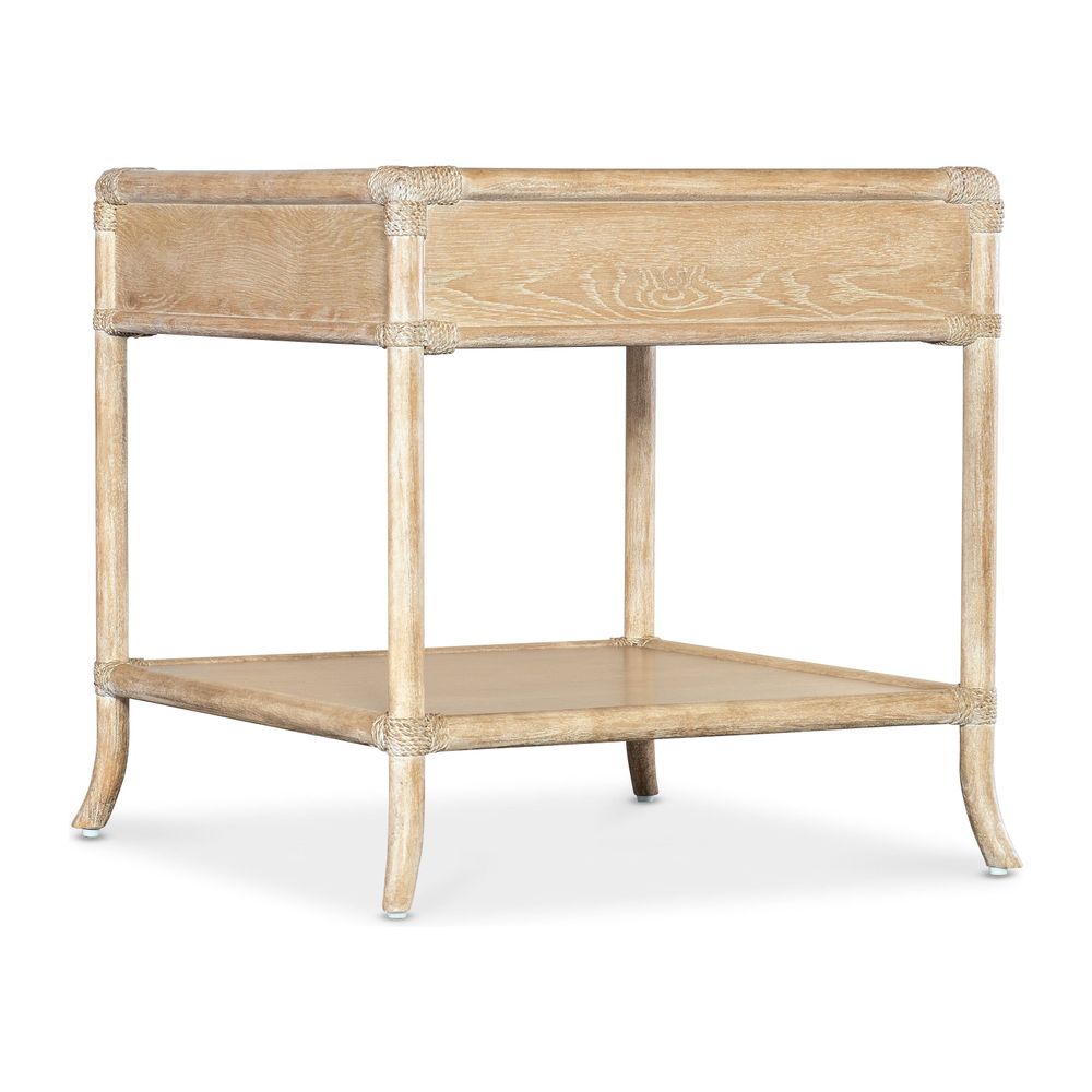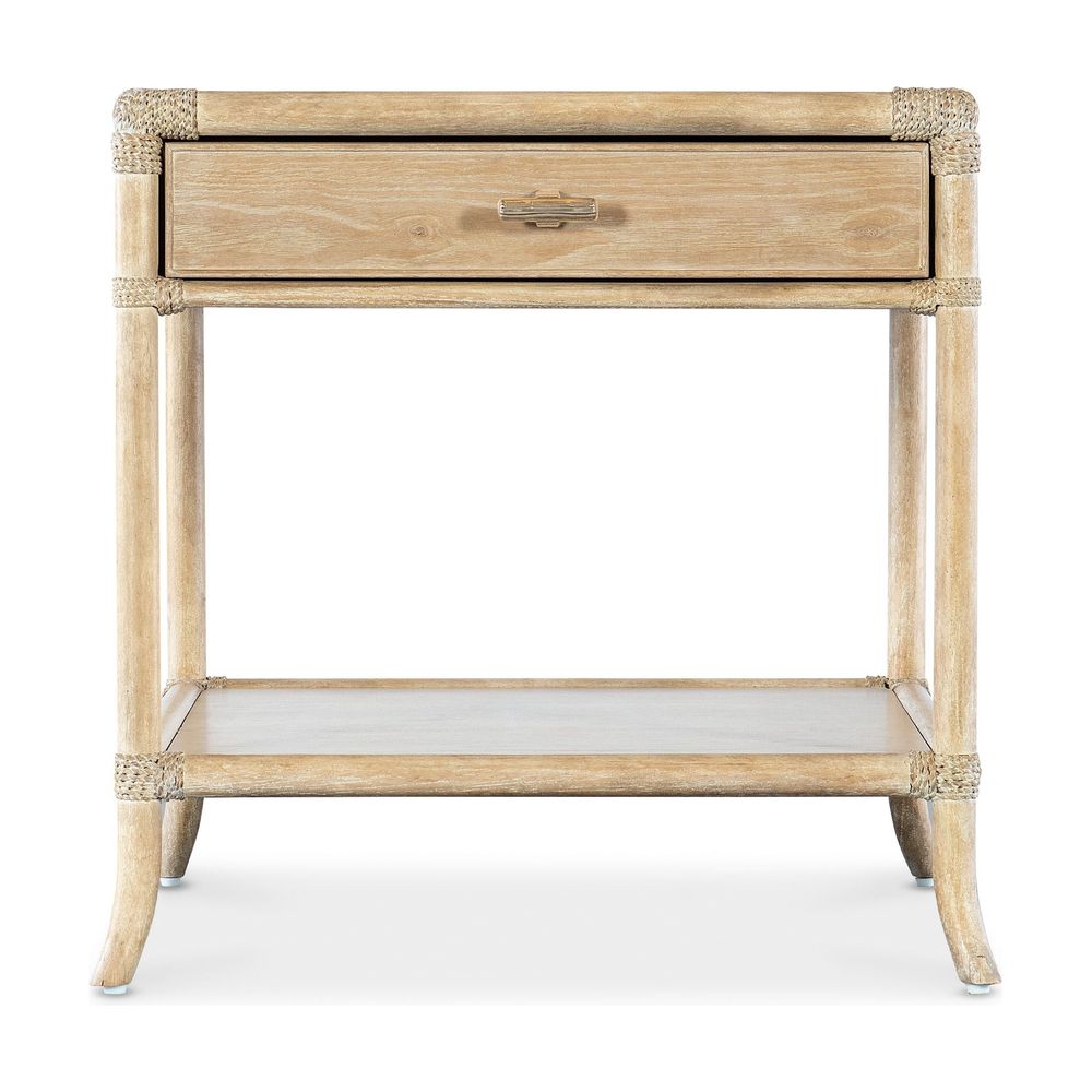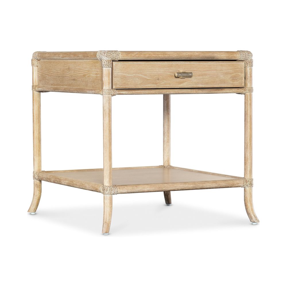 Description: Inspired by tropical getaways, the Solace Pole Rattan End Table is a mixture of natural materials in a laid-back, versatile design. Crafted of Oak and Maple Veneers with Rope accents at the joints, the table is finished in the sand-colored Dune, transparent by design to showcase the unique grain patterns of the wood veneer. Finished on all sides, the table has one self-closing drawer, one fixed shelf and is accented by soft pewter-colored "T" pulls.