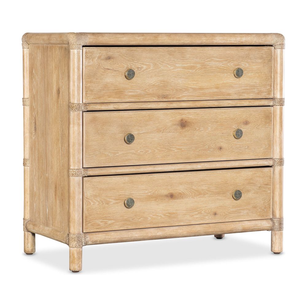 Description: Inspired by tropical getaways, the Solace Pole Rattan Nightstand is a blend of natural materials in a laid-back, versatile design. Crafted of Oak and Maple Veneers with Rope accents, the nightstand is finished in the sand-colored Dune, transparent by design to reveal the unique grain patterns in the wood veneer. Featuring three self-closing drawers, the nightstand is accented by soft pewter-colored round knobs.