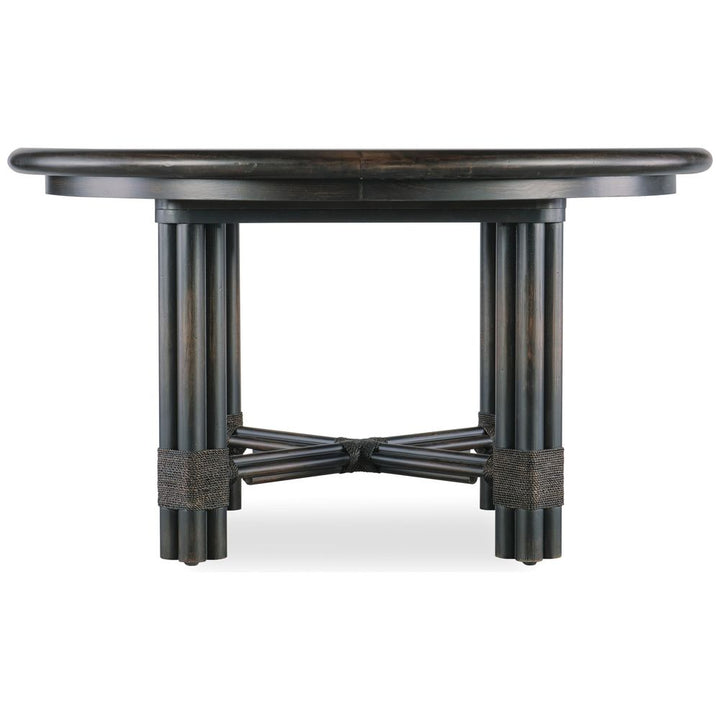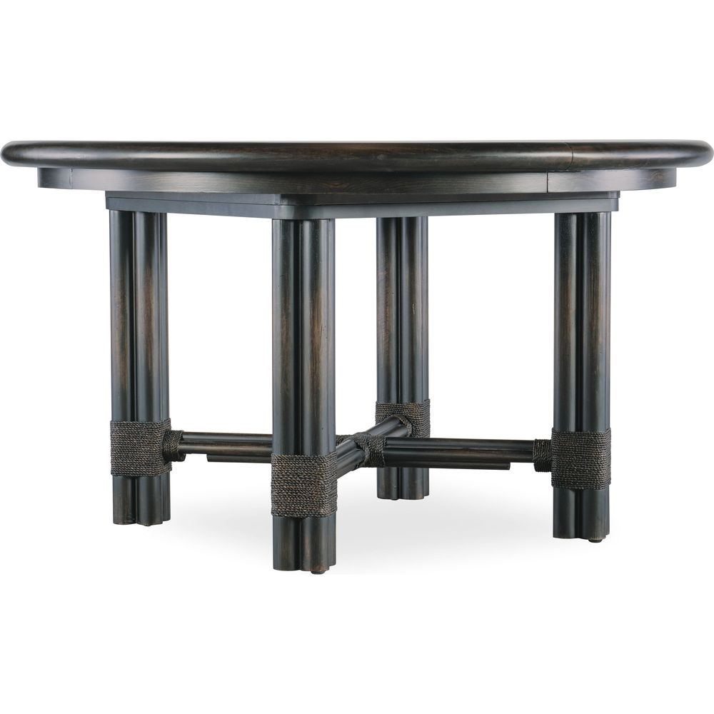 Description: With a tropical retreat-inspired vibe accented by organic details, the Solace Pole Rattan Round Dining Table has a bundled-pole-designed motif with rope accents. Crafted of Oak Veneers, it features the Black Sand finish, transparent by design to reveal unique grain patterns of the veneer. The tabletop has a Solid Wood edge. When the 20-inch leaf is in place, the table extends to 74 inches and accommodates up to 8 coordinating chairs. Without the leaf, it accommodates up to 6 coordinating chairs.