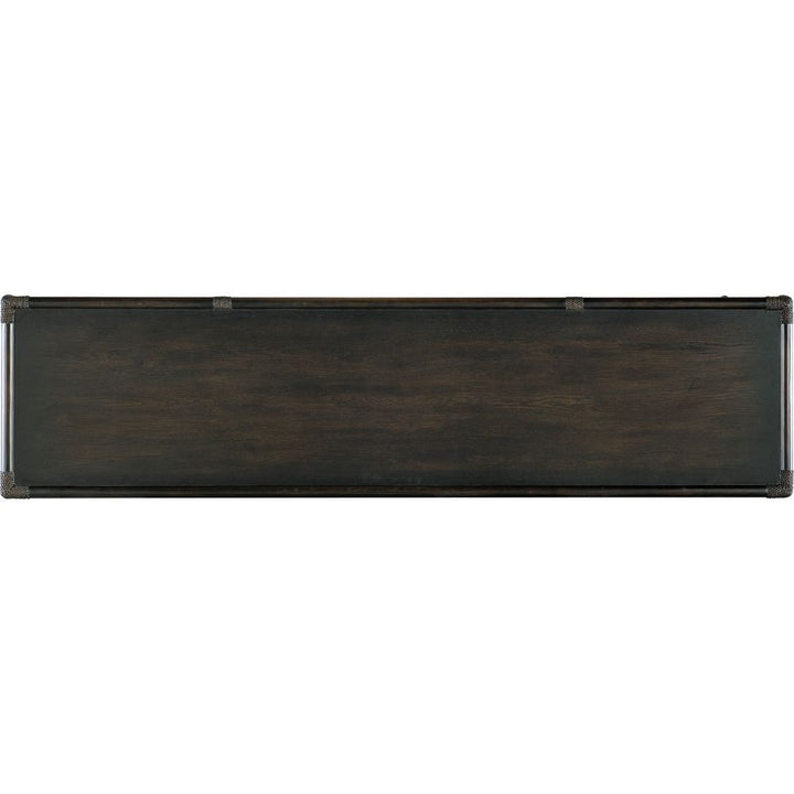 Description: With a laid-back island vibe and mix of organic materials, the Solace Pole Rattan Sideboard is crafted of Oak and Maple Veneers with rope accents at the joints. The Black Sand finish is transparent by design to reveal the unique grain patterns of the wood veneer. Featuring ample storage, the sideboard has two doors with magnetic door catches with one adjustable shelf behind each door. There are two self-closing drawers, and the top drawer has a removable felt liner and removable silverware tray. The lower fixed shelf is ideal for display or storage. Soft pewter bar pull and "T" pulls on the doors add a distinct accent.