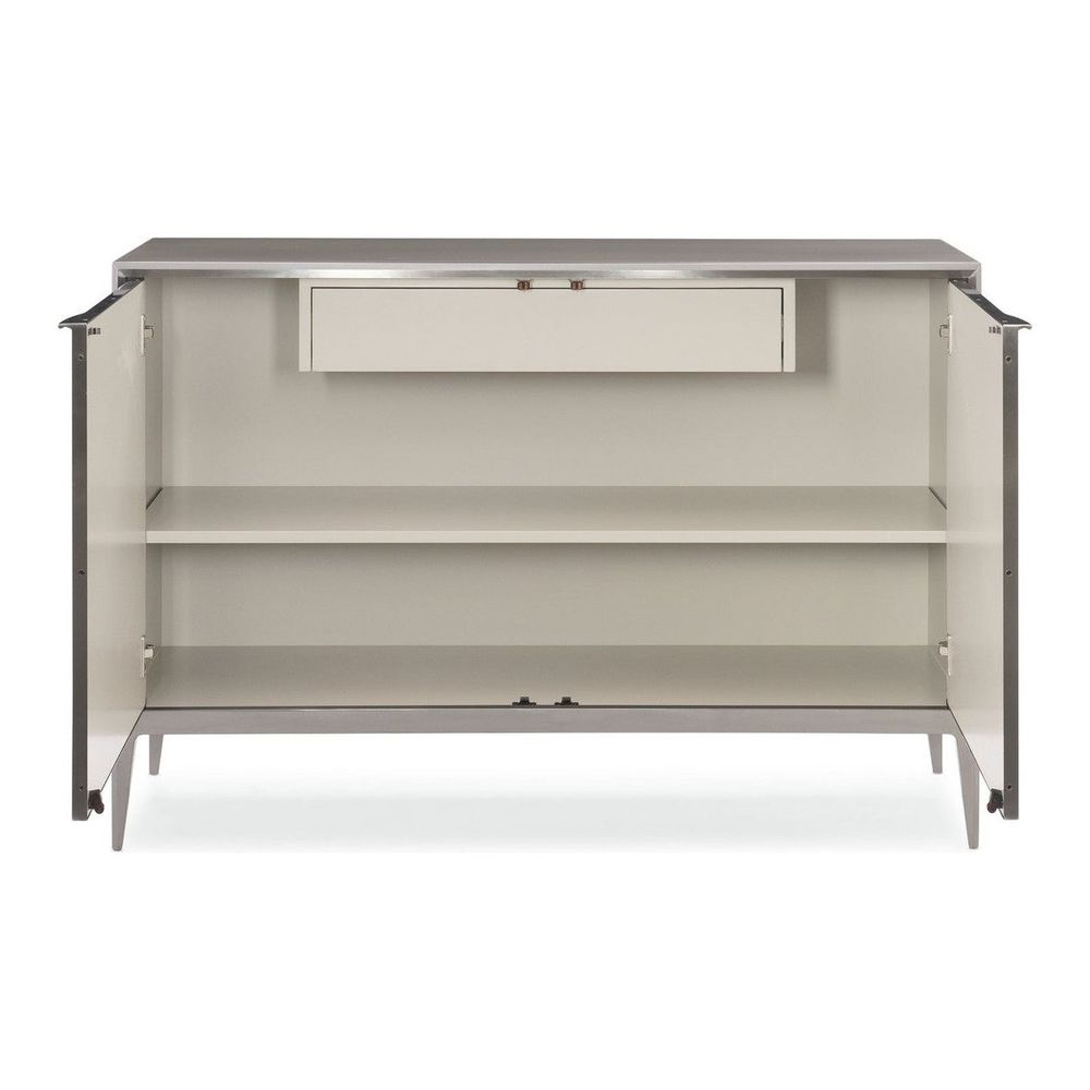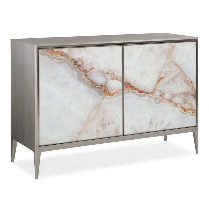 A stellar example of nature's beauty, the Rock Steady cabinet adds modern character to any space. Wrapped in a metal frame highlighted with a Brushed Nickel finish, its two glass doors feature a one-of-a-kind painted agate pattern in a color palette of cool whites and grays punctuated by earthy shades of terracotta. Subtle finger pulls add function without taking away from the stunning brilliance of its design. Inside, you'll find a storage area fully finished in Putty with an adjustable shelf and storage drawer. Tapered legs complete the look of this fashionable statement piece.